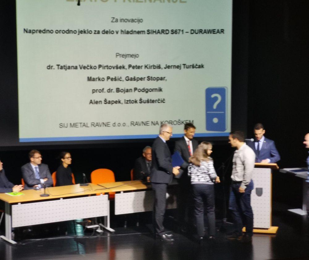 Nagrajenec: SIJ METAL RAVNE d.o.o., RAVNE NA KOROŠKEM. Naslov inovacije: Napredno orodno jeklo za delo v hladnem SIHARD S671 – DURAWEAR. Inovatorji: dr. Tatjana Večko Pirtovšek, Peter Kirbiš, Jernej Turščak, Marko Pešić, Gašper Stopar, prof. dr. Bojan Podgornik (Inštitut za kovinske materiale in tehnologijo), Alen Šapek (SIJ Ravne Systems), Iztok Šušterčič (SIJ Acroni). Novo, na zraku kaljivo orodno jeklo za delo v hladnem, je rezultat lastnega razvoja in je zaradi inovativnega koncepta legiranja s titanom novost v svetovnem merilu. Jeklo SIHARD S671 s superiornimi lastnostmi predstavlja inovacijo tako za podjetje kot za Slovenijo in svetovni trg. Je prvi primerek v svetu, saj na trgu tovrstno vsestransko uporabno jeklo ne obstaja. Zaradi izvrstne kombinacije zelo visoke abrazijske odpornosti in visoke žilavosti lahko nadomesti standardno jeklo SIHARD 2379 v vseh njegovih aplikacijah. Trg za prodajo jekla SIHARD S671 je globalen, vendar nišen, kot je trg orodnih jekel. Pri razvoju inovacije so sodelovali strokovnjaki iz podjetja SIJ Metala Ravne (razvojna ekipa, tehnologija, proizvodnja in prodaja), v okviru skupnih razvojnih timov so se vključili tudi iz podjetja SIJ Ravne Systems ter iz Inštituta za kovinske materiale in tehnologijo, pri testiranju pa SIJ Acroni.