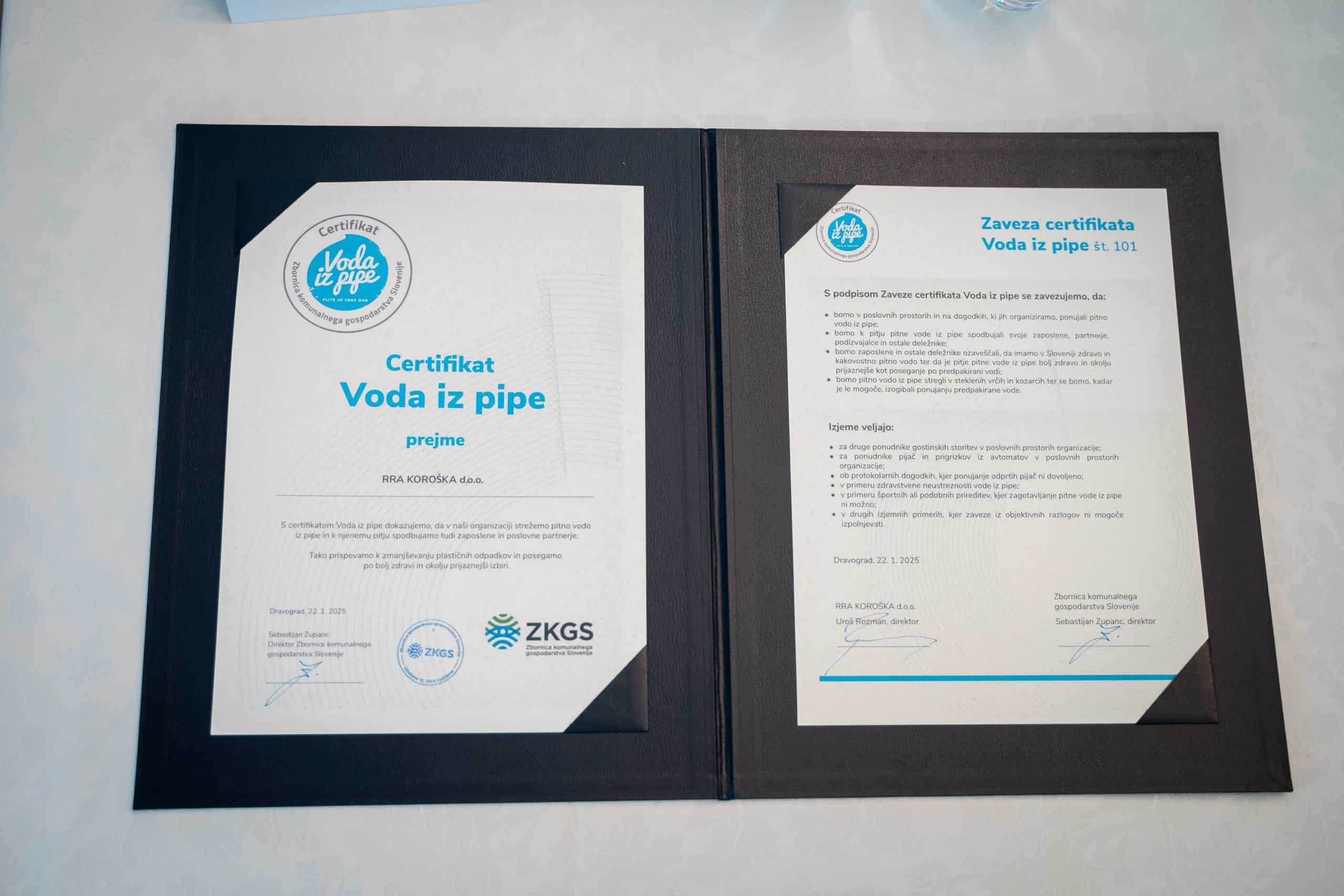 V okviru Regionalne razvojne agencije za Koroško so se odločili, da pristopijo kot zavedno trajnostno naravnana agencija uglednim organizacijam in podjetjem, ki skrbijo za varovanje okolja in s tem prihodnost nas in naših otrok. Odločili so se, da s strani Zbornice komunalnega gospodarstva Slovenije pridobijo certifikat, ki daje zgled za odpravo okolju škodljivih praks ter poziva širšo javnost k bolj prijaznim, trajnostnim in modrim pristopom pri vsakodnevnem uživanju vode in aktivno opozarja na pomen zmanjševanja količine odpadkov.