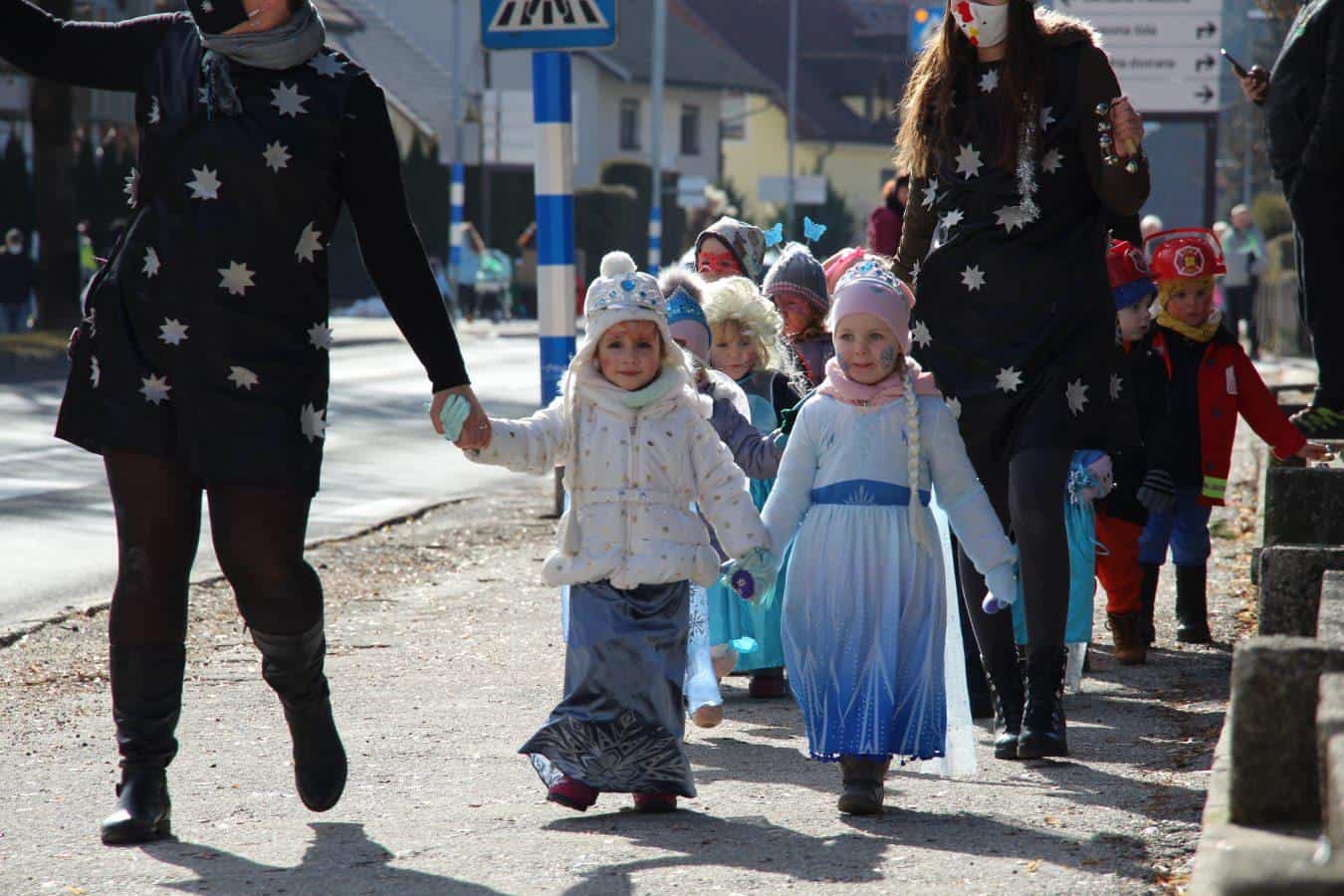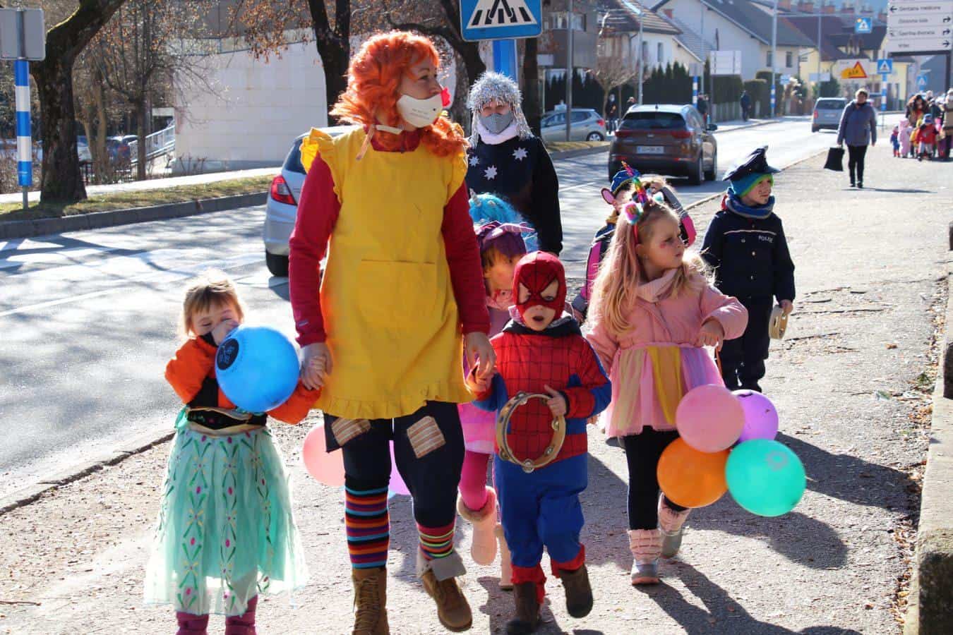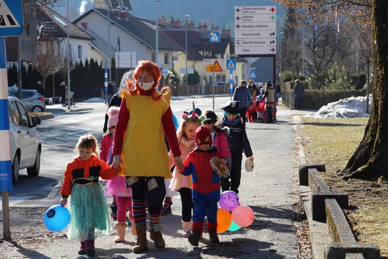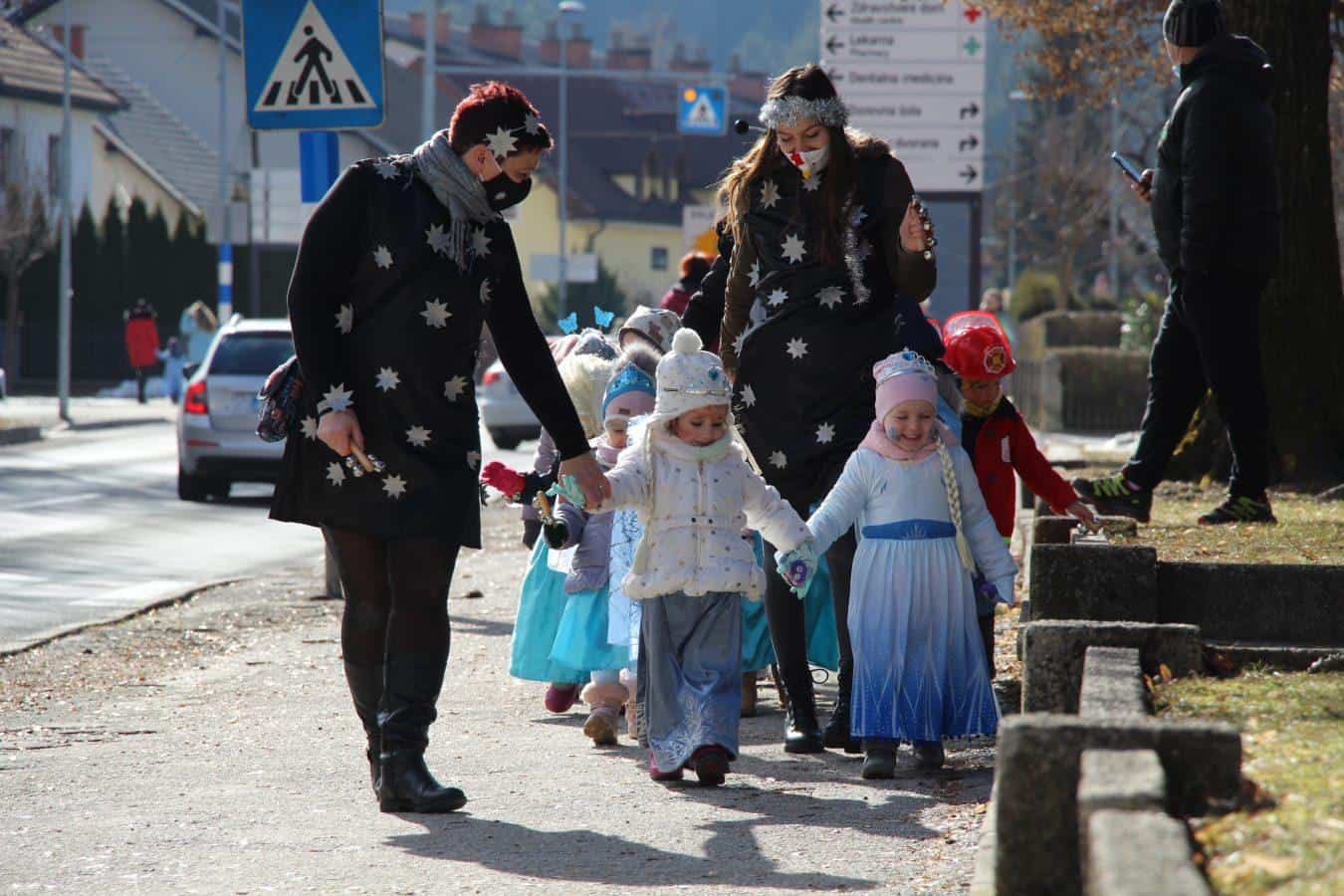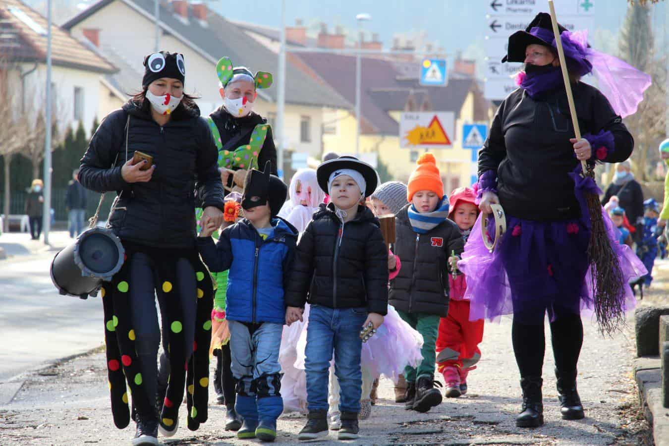 Po pustnem plesu pa so se maškare v pisanih “mehurčkih” podale še na sprehod po Mežici. Mimoidoče so razveseljevali s pustnimi pesmicami in klicali pomlad, v upanju, da z zimo odženejo tudi koronavirus,