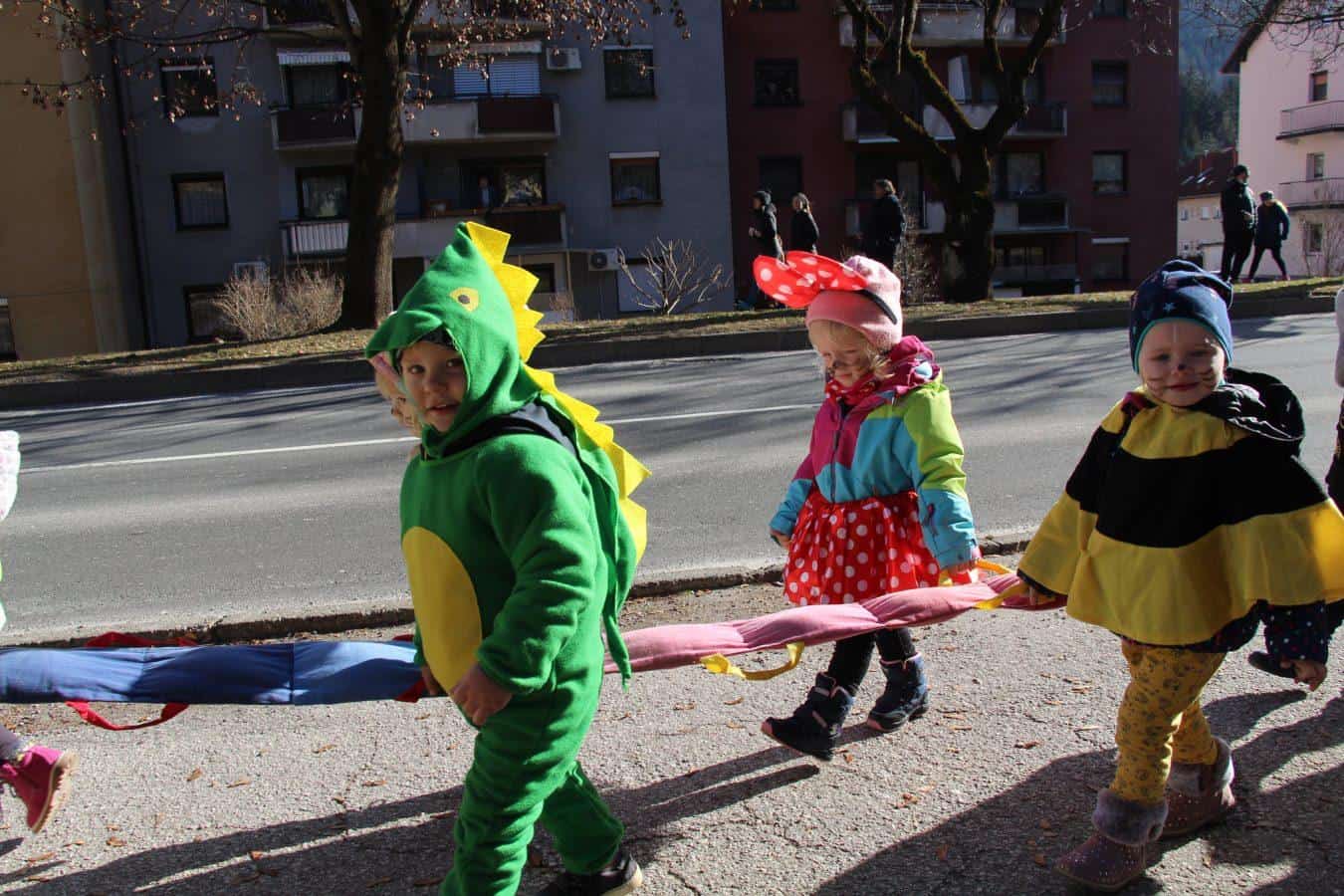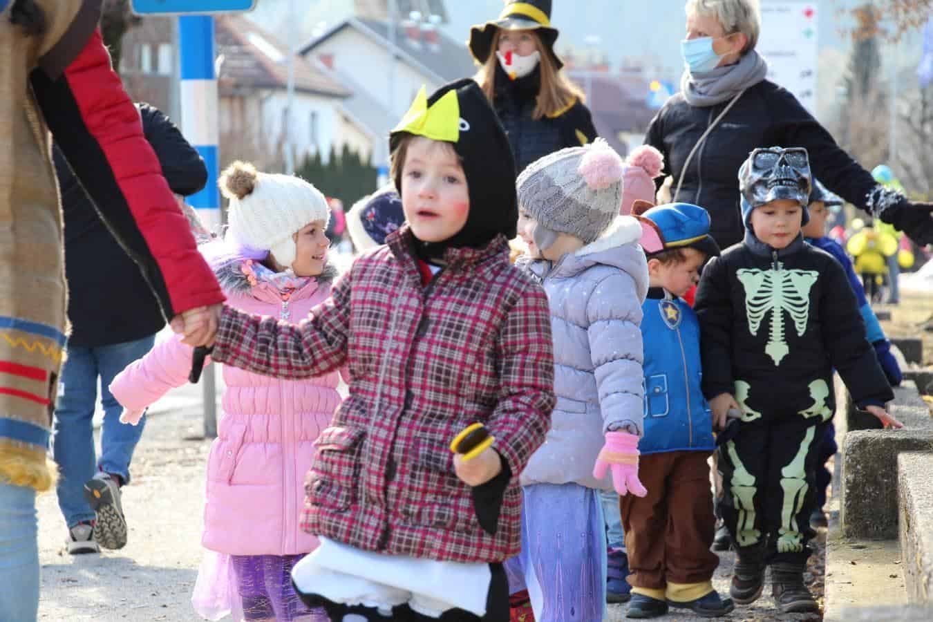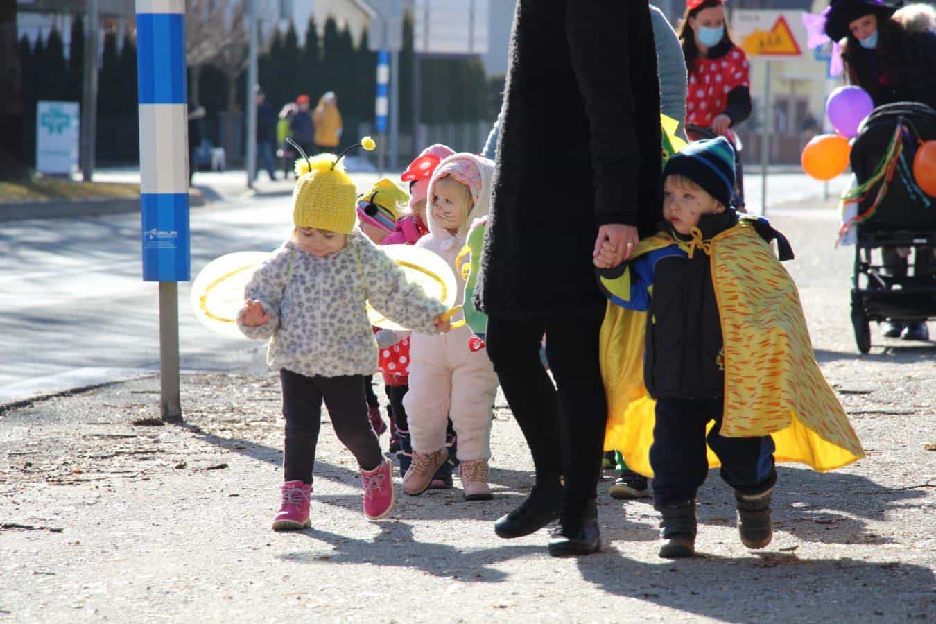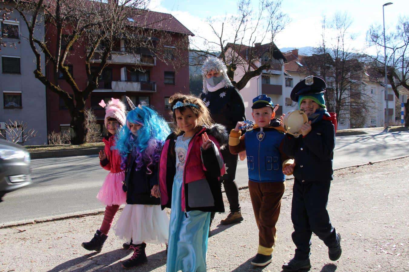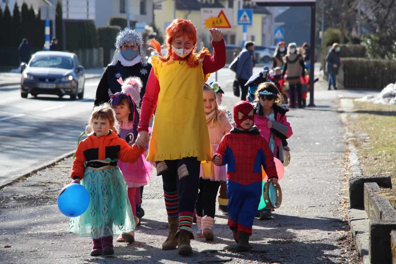 Po pustnem plesu pa so se maškare v pisanih “mehurčkih” podale še na sprehod po Mežici. Mimoidoče so razveseljevali s pustnimi pesmicami in klicali pomlad, v upanju, da z zimo odženejo tudi koronavirus,
