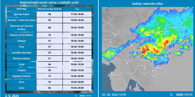 Po poročanju Arsa so najmočnejše sunke vetra izmerili na Koroškem, v Šmartnem pri Slovenj Gradcu je njihova postaja izmerila sunek 88 km/h.