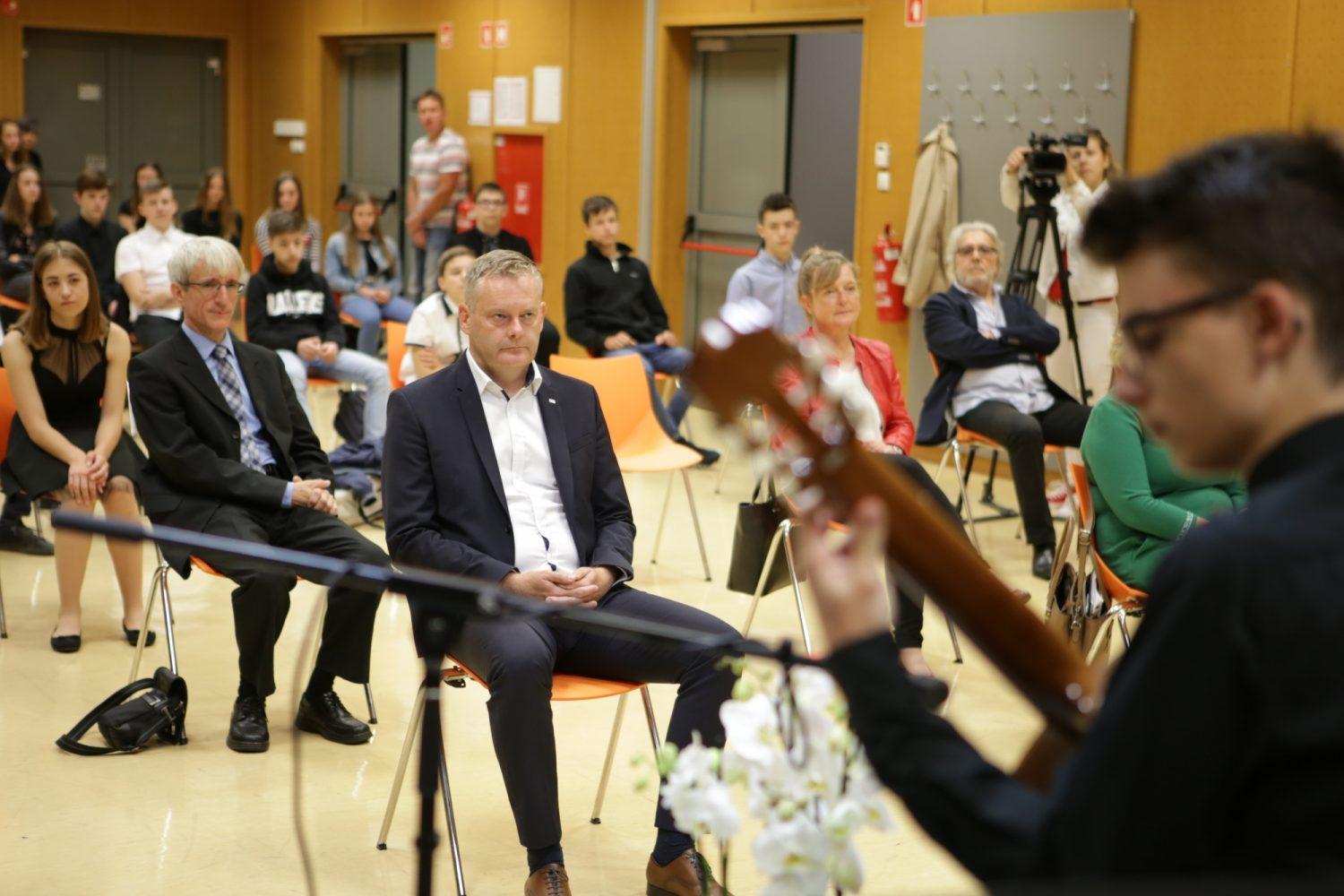 Klugler je v pozdravnem govoru povedal, da si bo moč leto 2020 še posebej zapomniti kot obdobje nepredstavljivih izzivov. "In vendar ste pokazali izjemno stopnjo zrelosti, prilagodljivosti in predanosti", so bile besede s katerimi je nagovoril vse učitelje, učence in ostale prisotne. "Brez vsega tega danes šolskega leta ne bi mogli uspešno zaključiti in posledično se tudi danes ne bi družili na tej prireditvi, s katero tradicionalno počastimo šolske uspehe najboljših izmed vas." Vsem je čestital in zaželel prijetne in zaslužene počitnice.