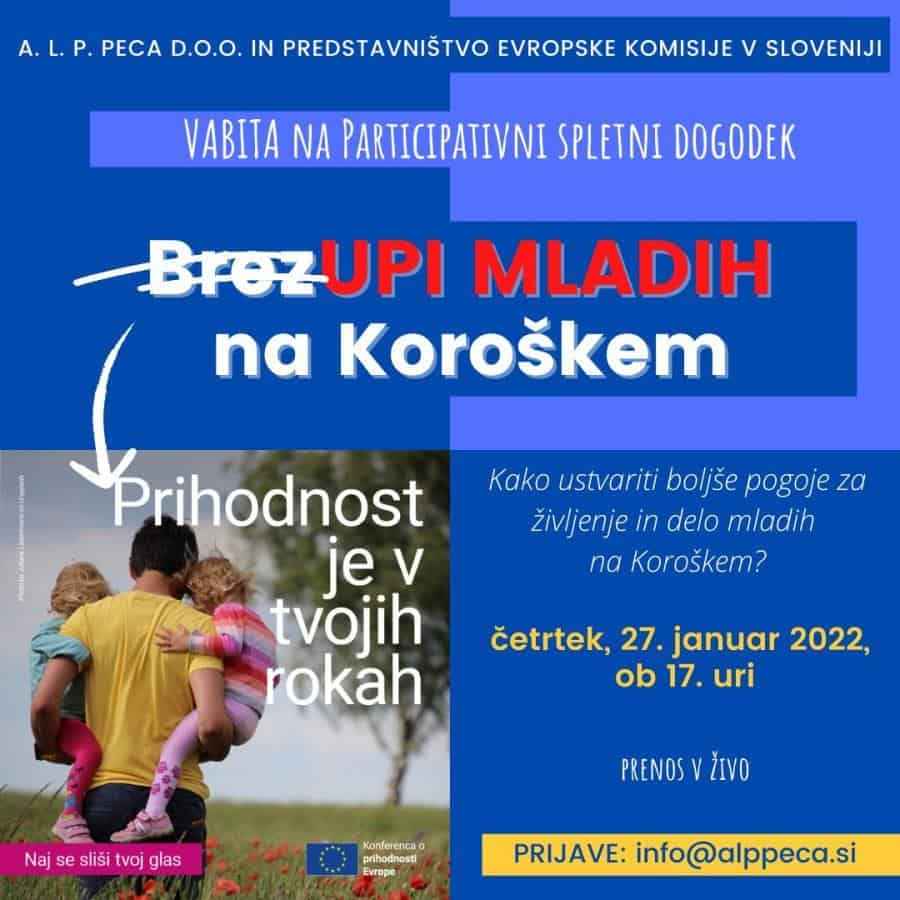 S tem namenom podjetje A. L. P. Peca d.o.o. in Predstavništvo Evropske komisije v Sloveniji organizirata participativni spletni dogodek "BrezUPIMLADIH na Koroškem – kako ustvariti privlačne pogoje za delo in življenje mladih na Koroškem?", ki se bo odvil v četrtek, 27. januarja 2022, ob 17. uri.
