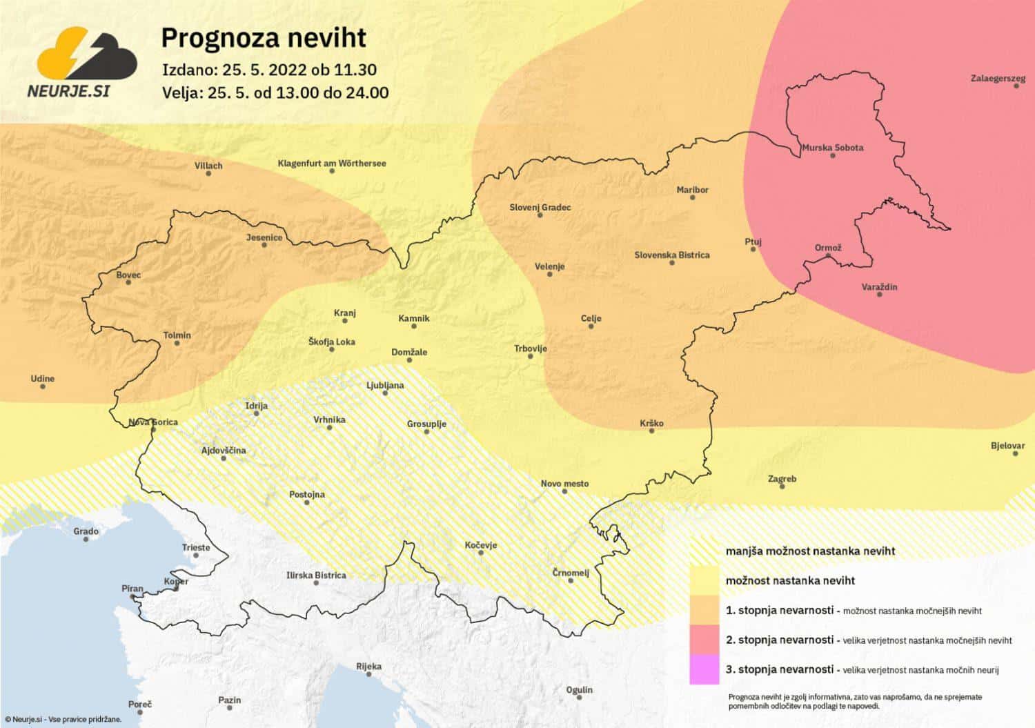 Ob ugodnih vetrovnih pogojih in veliki zalogi potencialne konvektivne energije (CAPE), ki bo znašala do 1500 J/kg, bo predvsem v severovzhodni Sloveniji možen razvoj močnih neviht in krajevnih neurij. Neurja lahko spremljajo silovit nevihtni piš, močni nalivi in debelejša toča. Predvsem v Prekmurju je možen razvoj superceličnih neviht, ki bodo nato potovale v smeri Madžarske in severovzhoda Hrvaške.