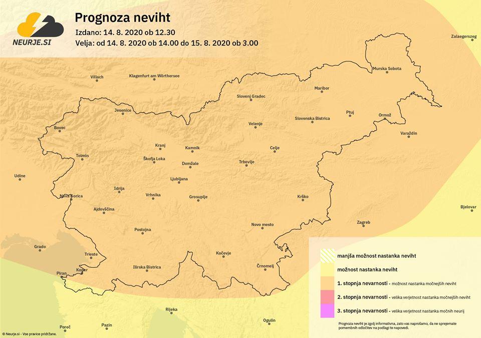 Lokalno so na Koroškem, Štajerskem, Dolenjskem in deloma v osrednji Sloveniji možna krajevna neurja z močnimi nalivi, sunki nevihtnega piša in točo. Slednja lahko lokalno popoldan ob kakšni dovolj razviti nevihti v premeru doseže debelino 4 cm. V zelo kratkem času lahko, ob prehodu nevihtnega sistema, pade večja količina dežja, ki utegne lokalno povzročati težave. Možen je hiter porast hudourniških vodotokov in poplavljanje izpostavljenih objektov in cest.