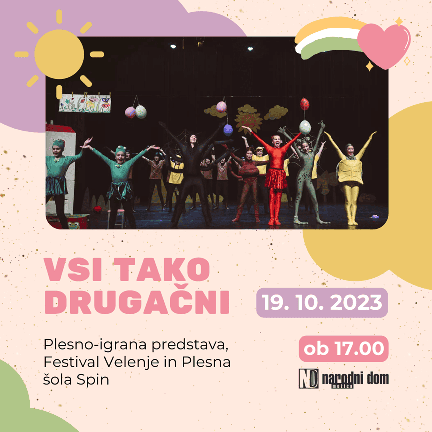 V četrtek, 19. oktobra 2023, ob 17. uri bo na sporedu prva otroška abonmajska plesno igrana predstava VSI TAKO DRUGAČNI v izvedbi Festivala Velenje in Plesne šole Spin.