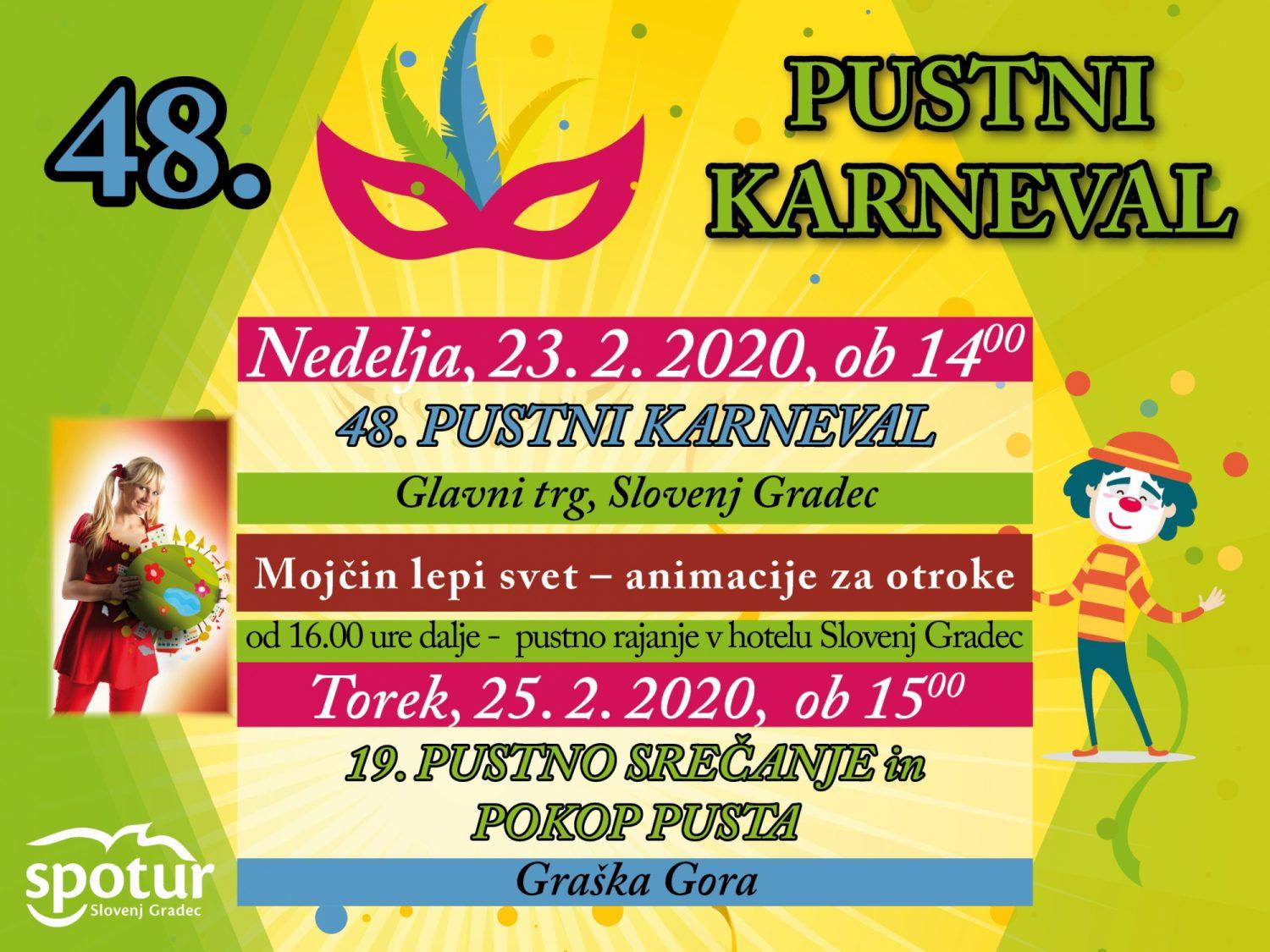 Iz Javnega zavoda Spotur, ki organizira pusti karneval so sporočili, da pričakujejo udeležbo več kot 15 pustnih skupin, ki bodo na šaljiv način predstavile številne aktualne teme. "Pričakujemo tudi veliko število otroških pustnih skupin iz slovenjgraških vrtcev in šol, pričakujemo več kot 500 sodelujočih." so dodali. Poskrbljeno bo tudi za otroške animacije, od 16. ure dalje pa bo v hotelu Slovenj Gradec pustno rajanje.