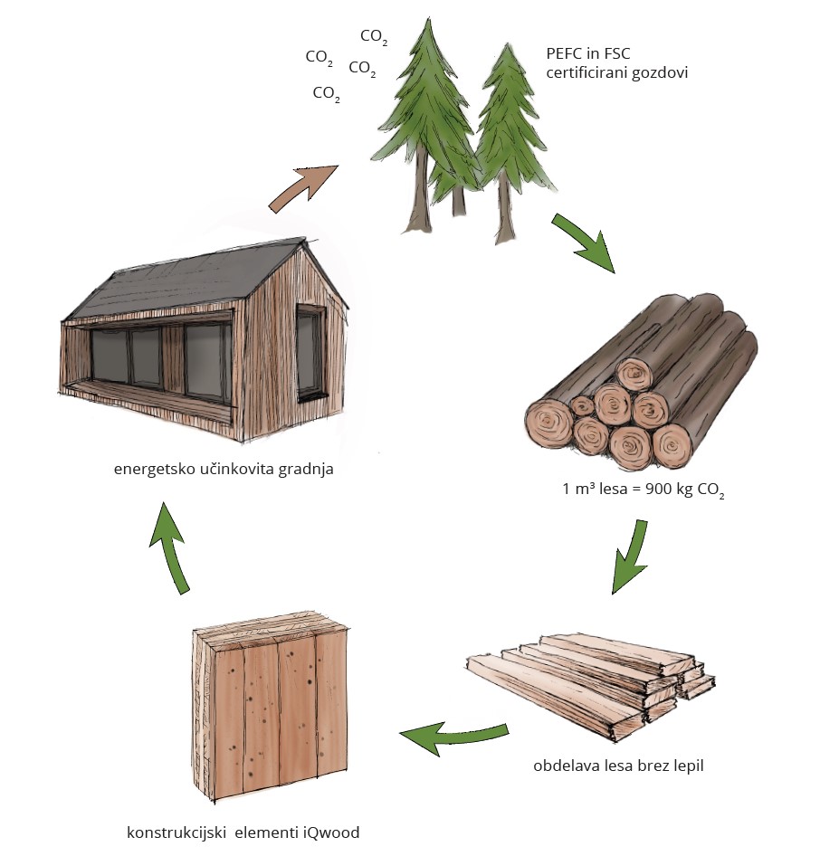 Les ima izjemno sposobnost shranjevanja CO₂, saj en kubični meter lesa skladišči približno eno tono ogljikovega dioksida. Tako objekt iz masivnega lesa ni le okolju prijazen, temveč dejavno prispeva k zmanjševanju ogljičnega odtisa gradnje. Skupaj z naravno sestavo brez škodljivih snovi predstavlja sistem iQwood eno najnaprednejših rešitev za trajnostno gradnjo prihodnosti.