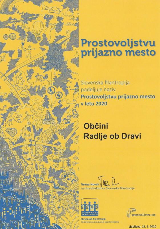 Občina Radlje ob Dravi podpira in omogoča delo različnim prostovoljskim organizacijam. Na različnih prireditvah promovira in spodbuja prostovoljstvo, v letu 2020 pa namerava razširiti bazo prostovoljcev ter še naprej nuditi brezplačne prostore za izvajanje prostovoljskih programov. Za prostovoljsko pomoč pri prevozih starejših je občina priskrbela tudi novo e-vozilo, so pojasnili pri filantropiji. Župan mag. Alan Bukovnik tudi z lastnim zgledom spodbuja občanke in občane, da se prostovoljsko aktivirajo na različnih področjih.