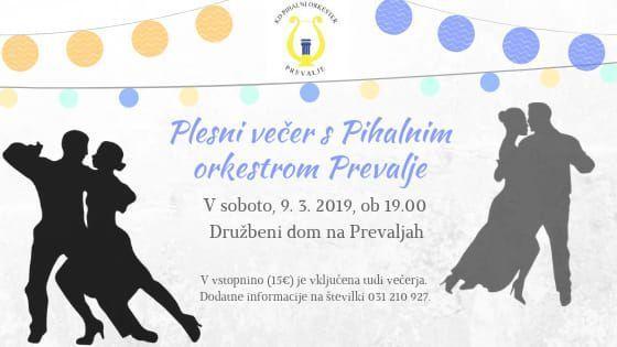 V soboto, 9. 3. 2019, ob 19:00 v Družbenem domu na Prevaljah Pihalni orkester Prevalje prireja tradicionalni plesni večer. Letošnji plesni večer bo sicer v znamenju gregorjevega, praznika ljubezni. Morda pa je tudi priložnost, da na ta dan svojo drago odpeljete na ples za njen praznik, praznik žensk. Več o prireditvi pa si lahko preberete na strani Koroških Novic s klikom na to