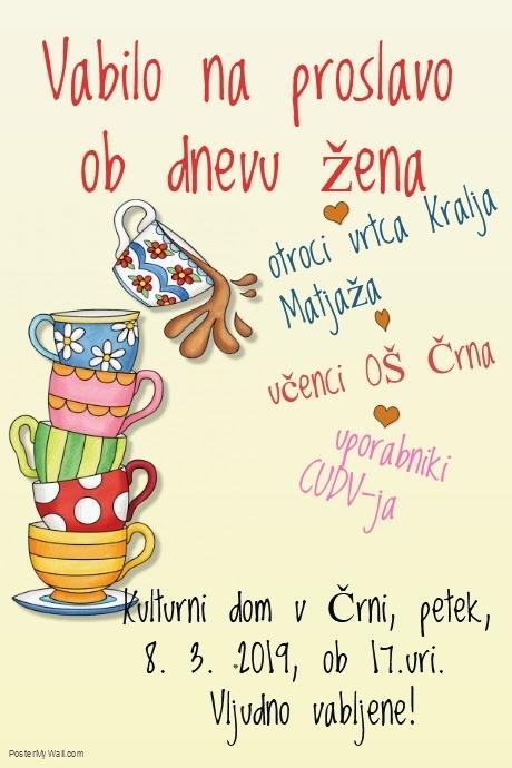 8. 3. 2019, ob 17.00 v Kulturnem domu Črna bodo nastopili učenci OŠ Črna na Koroškem, otroci Vrtca Kralj Matjaž in uporabniki CUDV Črna. Slavnostni govornik bo krajan dr. Tomaž Simetinger, etnolog, kulturni antropolog in dobitnik priznanja Zlati znak, enega najvišjih priznanj JSKD.