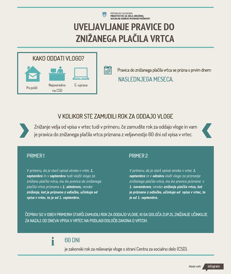 CSD odloča o vlogah po naslednjem vrstnem redu: najprej o otroškem dodatku, nato o državni štipendiji in šele nato o znižanem plačilu vrtca. Če se pravica do znižanega plačila vrtca izteče 31. avgusta, CSD o podaljšanju te pravice odloča s 1. septembrom. Vrtec nato izda položnico za plačilo vrtca za mesec september v mesecu oktobru.