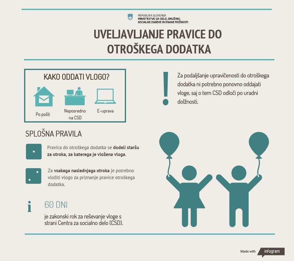 O podaljšanju pravice otroškega dodatka odloči CSD po uradni dolžnosti. V primeru, da ima eden od staršev že priznano pravico do otroškega dodatka za otroka, mora v primeru rojstva novega otroka ponovno vložiti vlogo za priznanje otroškega dodatka.