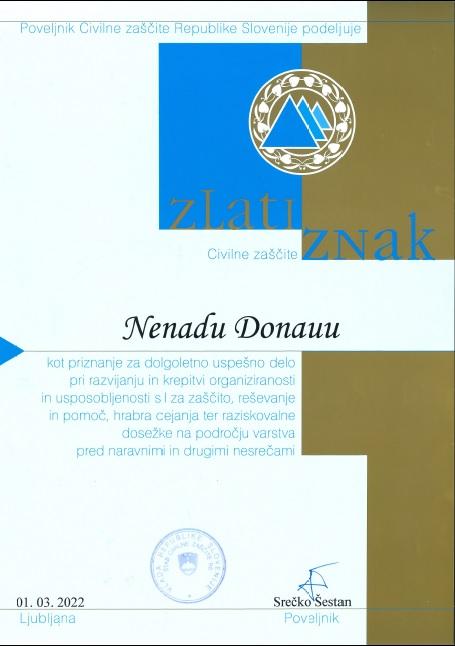 Nenad vrsto let uspešno opravlja delo na področju Zaščite, reševanja in pomoči v Občini Mežica. Od leta 2011 dalje je član Občinskega štaba Civilne zaščite občine Mežica. Učinkovito in vestno opravlja odgovorne operativne naloge v sistemu ZiR občine Mežica. Skupaj s poveljnikom OŠCZ Mežica sta operativno vzpostavila sistem ZiR v Občini Mežica. S svojo samoiniciativnostjo, vztrajnostjo, prodornostjo in doslednostjo, je omogočil razvoj sistema ZiR v Občini Mežica. Pomembno je prispeval k promociji in utrjevanju sistema varstva pred naravnimi in drugimi nesrečami.