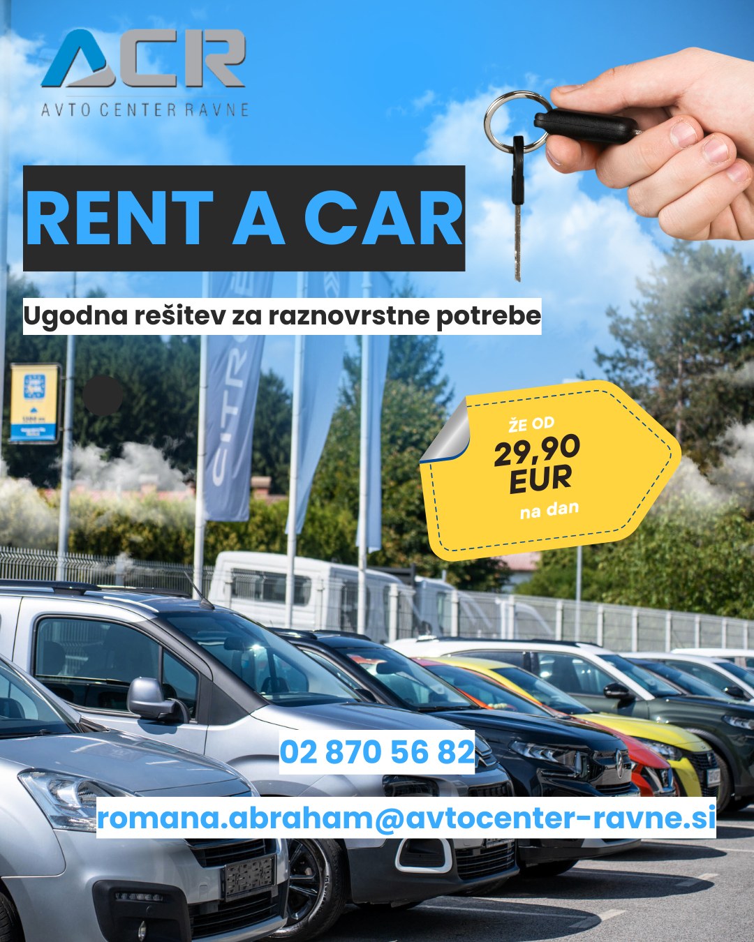 Na izlet, na poslovno pot ali pa za vsakodnevne opravke – v Avto centru Ravne vam ponujamo hitro rešitev, najem vozila po dostopnih cenah - že od 29,90 € na dan.