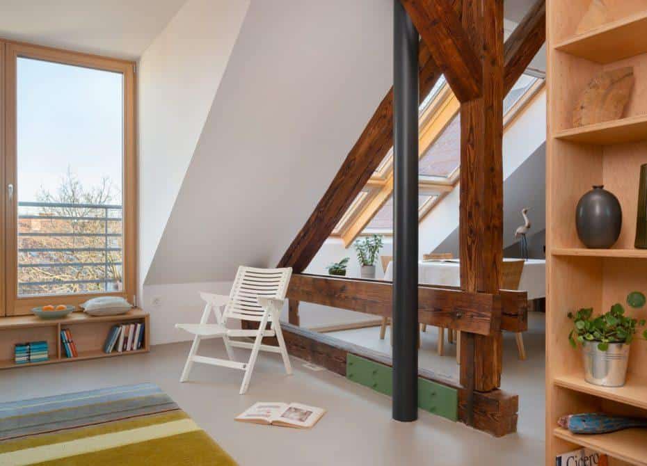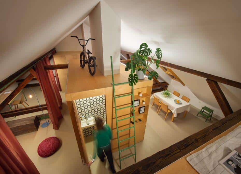 Nove prostorske dimenzije so z inovativno zasnovo mansarde prinesli odprti podesti. Po eni strani so prispevali k zračnosti prostora, po drugi pa ponudili dodatne oblikovalske možnosti in celo skladišče zmogljivosti. To velja tudi za podest nad kubusom, v katerem se nahaja kopalnica. Dejstvo je, da lahko takšno inovativno in zelo všečno zasnovo bivalnega prostora običajno ponudi le mansarda.