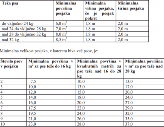 Če pes biva zunaj, mora imeti pesjak in uto oziroma drugo enakovredno zavetje. Če je zunanja temperatura nižja od 0°C, mora imeti pes na voljo primerno izoliran bivalni prostor. Psice z mladiči ter bolni psi morajo imeti na voljo bivalni prostor, v katerem temperatura ne sme biti nižja od 20°C.