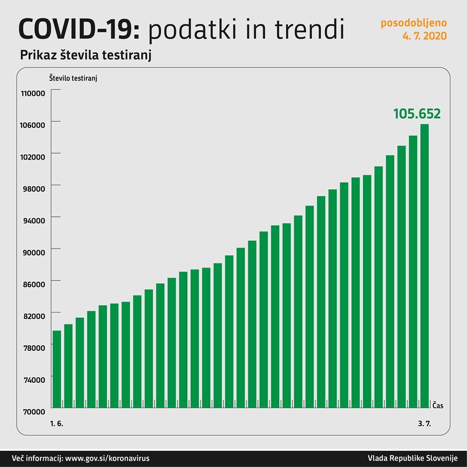 Doslej so v Sloveniji opravili 105.652 testov na covid-19, potrdili so 1679 okužb, trenutno je potrjenih aktivno okuženih 160 oseb, je razvidno iz podatkov Nacionalnega inštituta za javno zdravje, ki jih objavlja spletni portal sledilnik.org. Doslej je umrlo 111 bolnikov.
