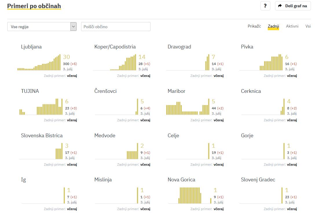 Včeraj so največ okužb vnovič potrdili v Ljubljani, in sicer pet. Med manjšimi občinami izstopa občina Črenšovci s štirimi potrjenimi primeri. Okužbe so sicer potrdili na različnih koncih Slovenije. Po dve okužbi so potrdili v občinah Maribor in Cerknica, po eno pa v še 14 občinah.