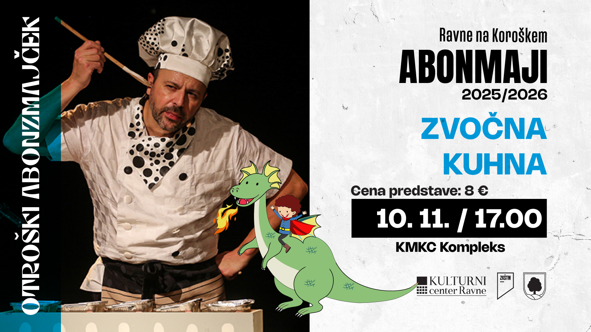 Ker na mladih svet stoji in jim moramo čim prej priučiti, da se kleti res nimajo za kaj bati, se predstave Otroškega Abonzmajčka v organizaciji Kulturnega centra Ravne tudi letos odvijajo na odru Kompleksa. V ponedeljek, 10. novembra, bodo naši najmlajši uživali v Zvočni kuhni, multisenzorni predstavi, ki bo združila kuharijo, glasbo, zvedavost in veselje.