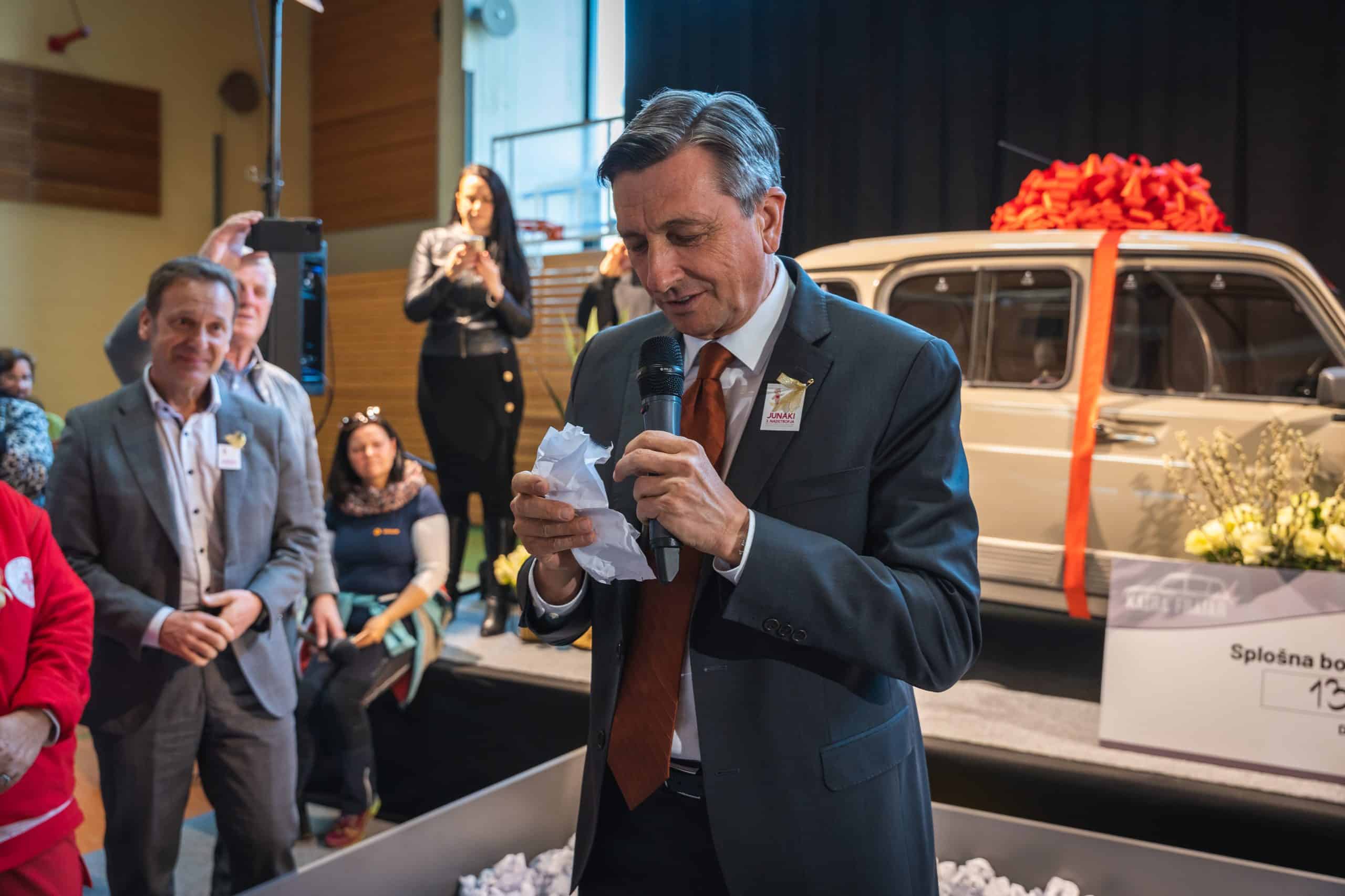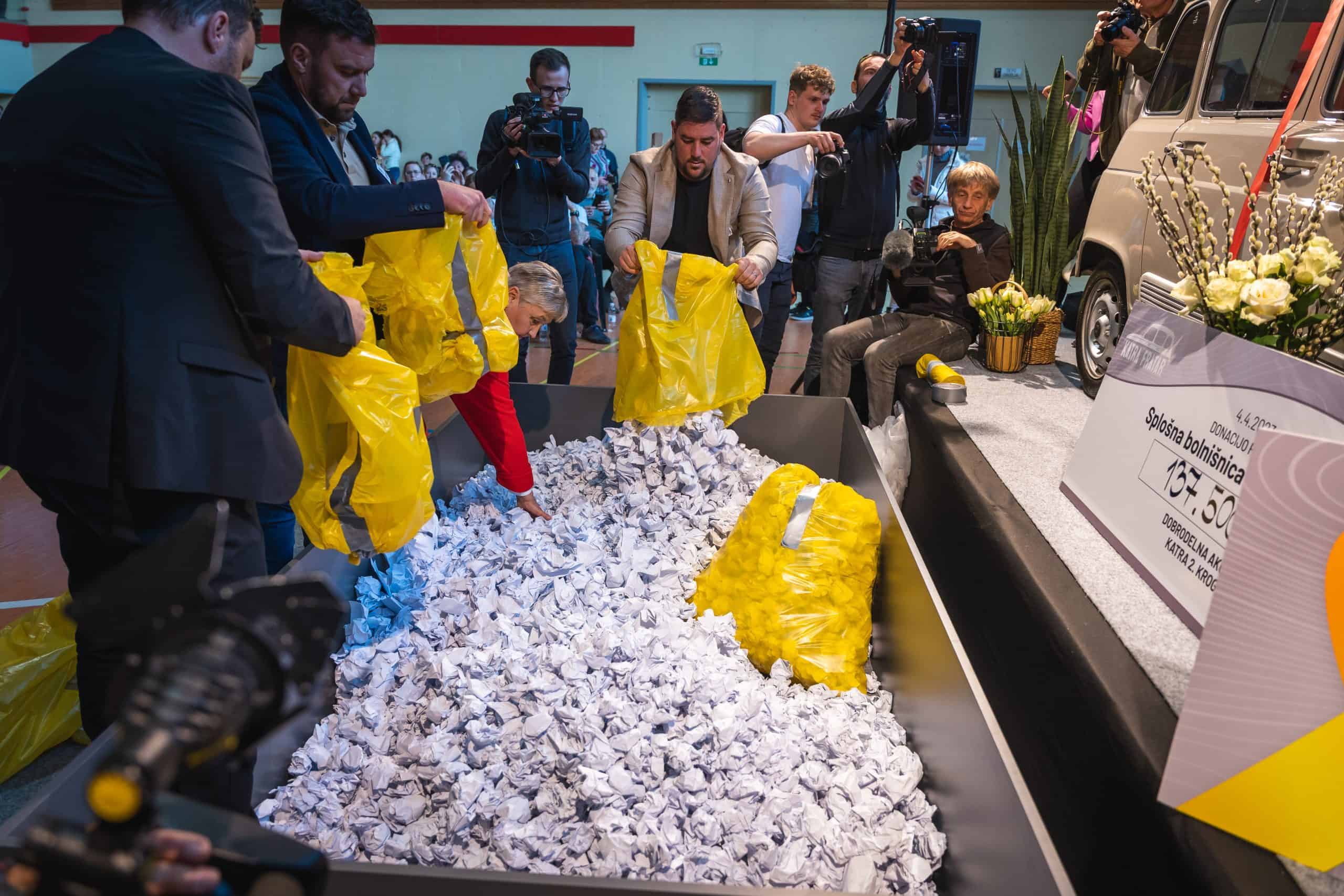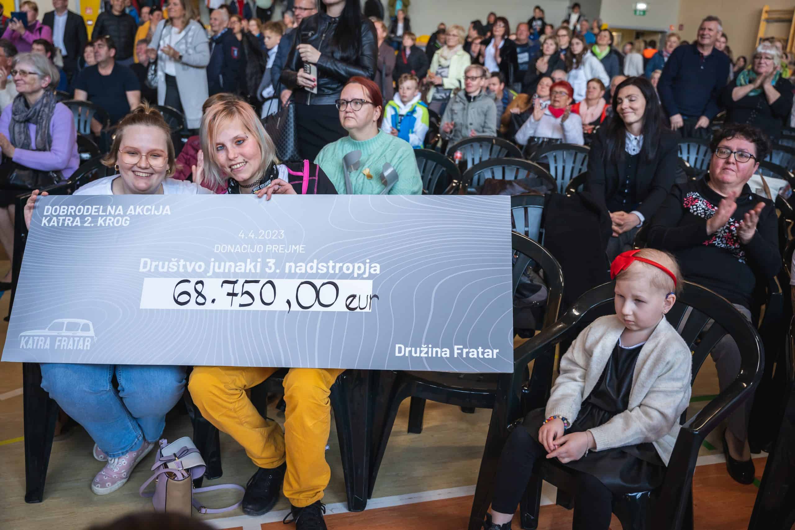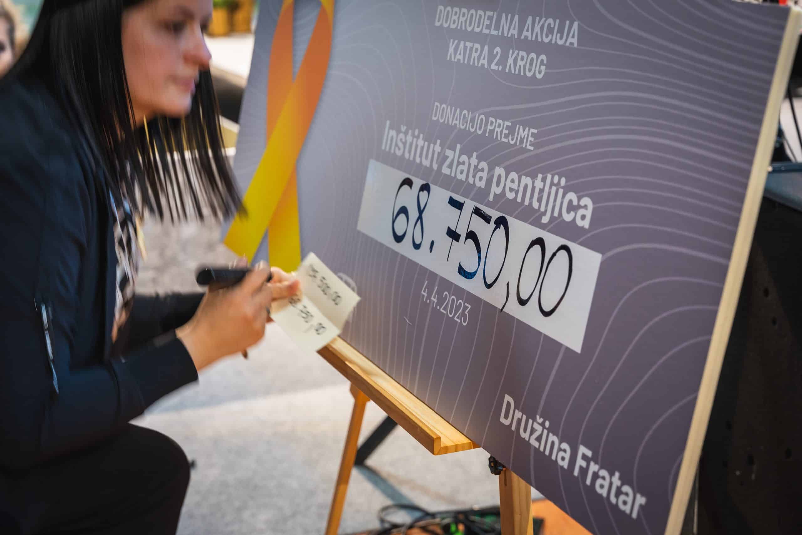 Izmed 5169 zbranih listkov, na katerih so bila zapisana imena donatorjev, ki so sodelovali v akciji Katre Fratar, so danes med dogodkom iz ogromne škatle, v kateri so bili vsi listki z imeni, izžrebali srečnega dobitnika trenutno najbolj slavne katre na svetu, Tomaža Habjana iz Škofje Loke.