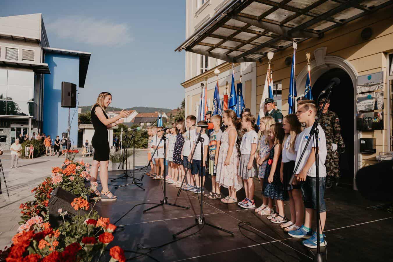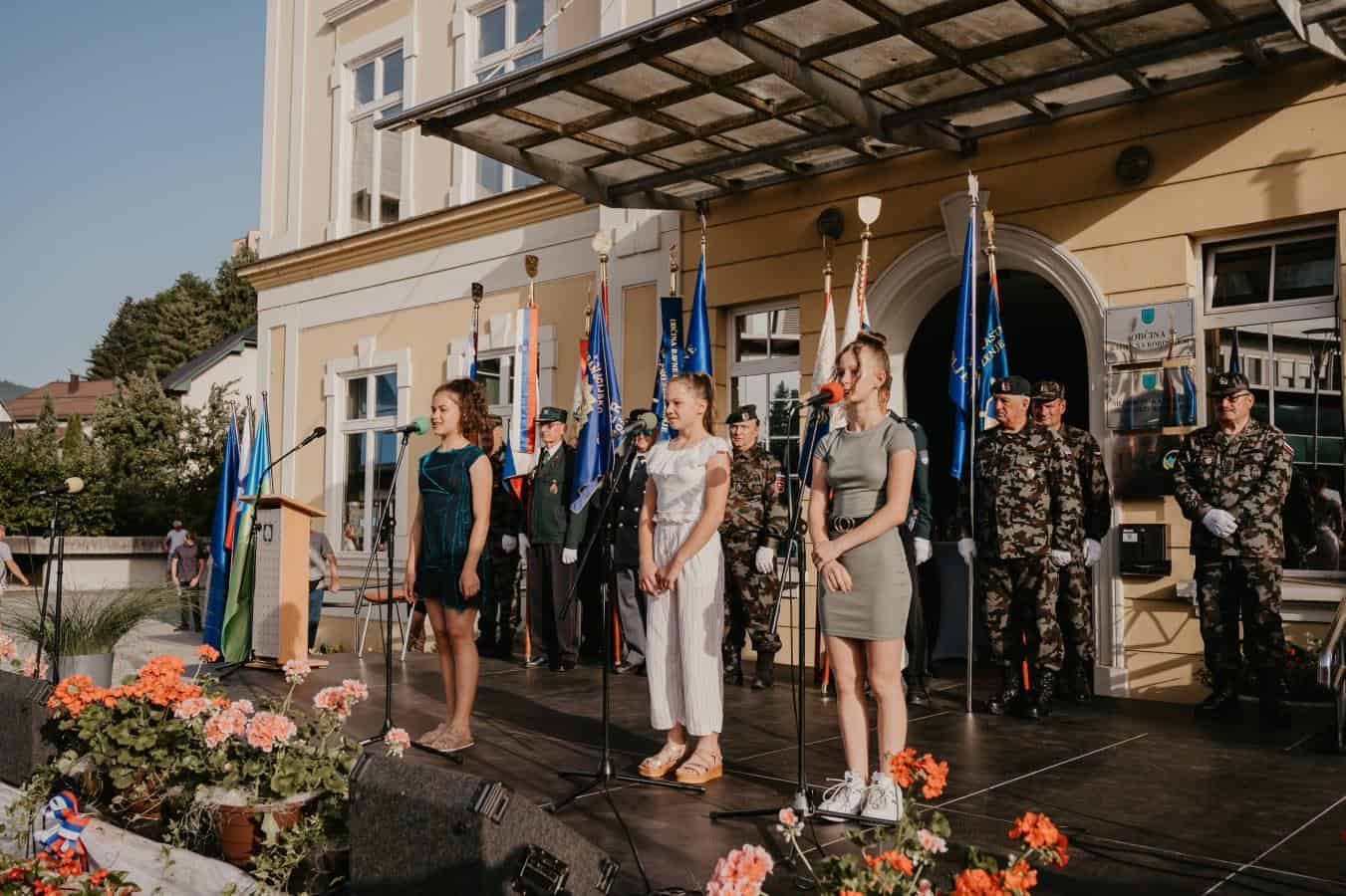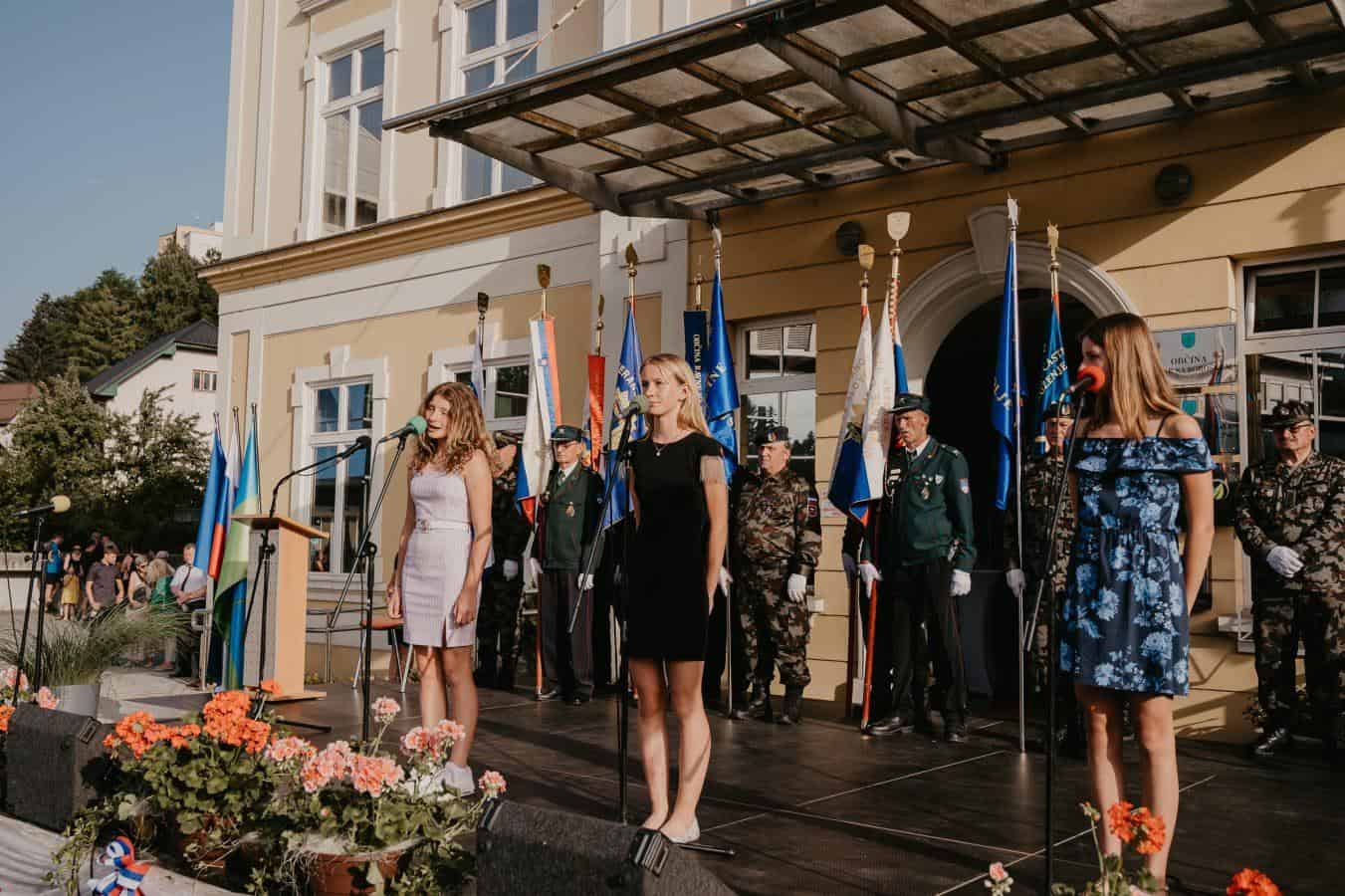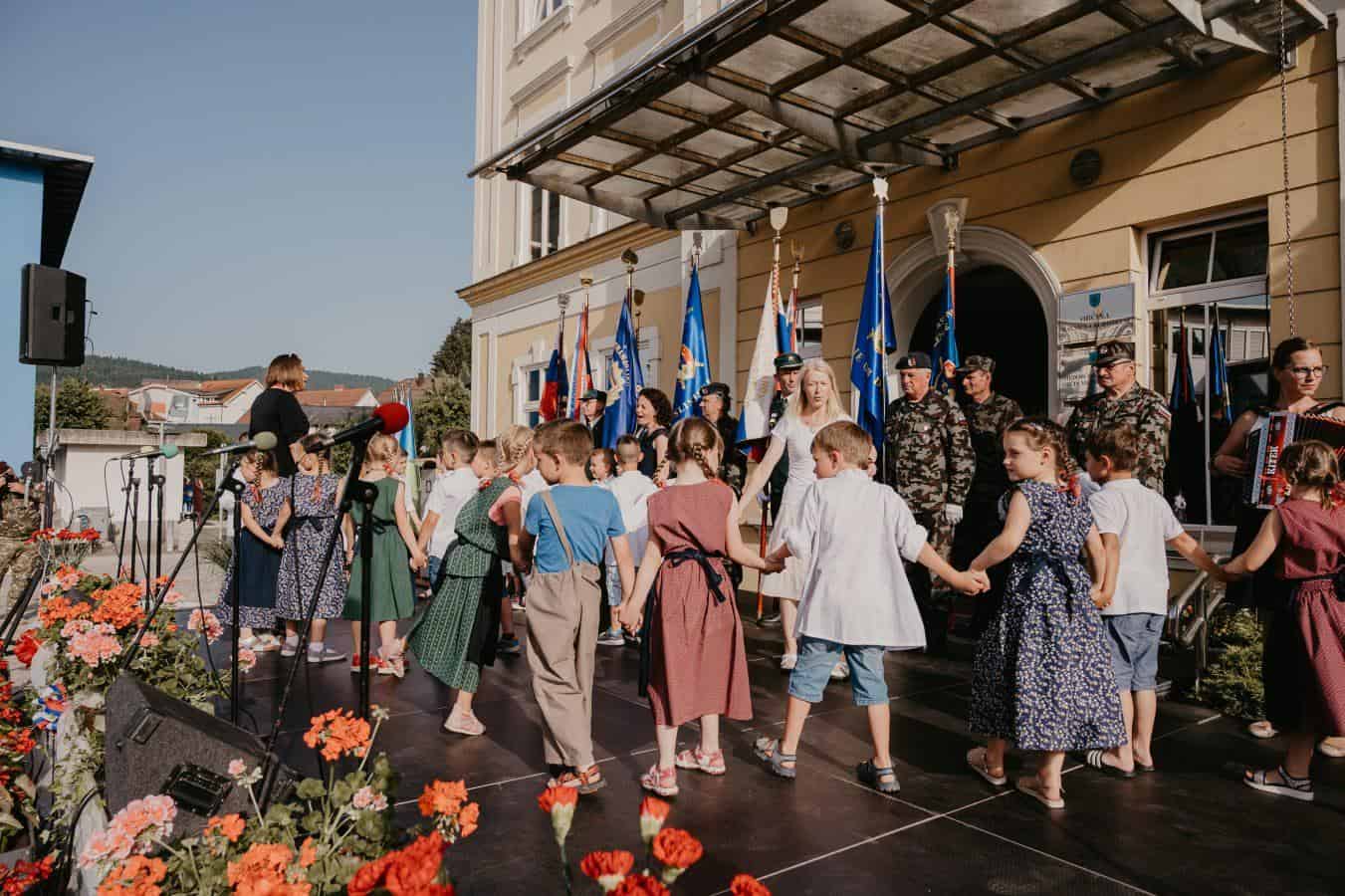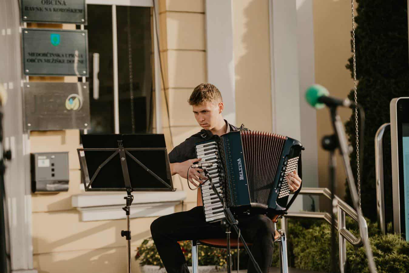 V plesnih korakih pa sta zbrane navdušila Jon Mori in Ina Belaj. Na harmoniki je učenec Glasbene šole Ravne Andraž Gangl izvedel narodni napev in zimzeleno Avsenikovo Slovenija, od kod lepote tvoje. Za posebej slavnostno vzdušje so poskrbele članice in člani našega Pihalnega orkestra Železarjev Ravne ter mnogi praporščaki pod vodstvom Jožeta Temnikarja.