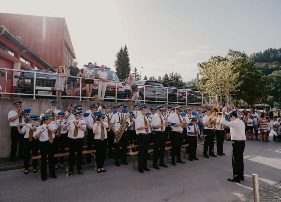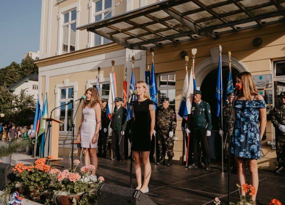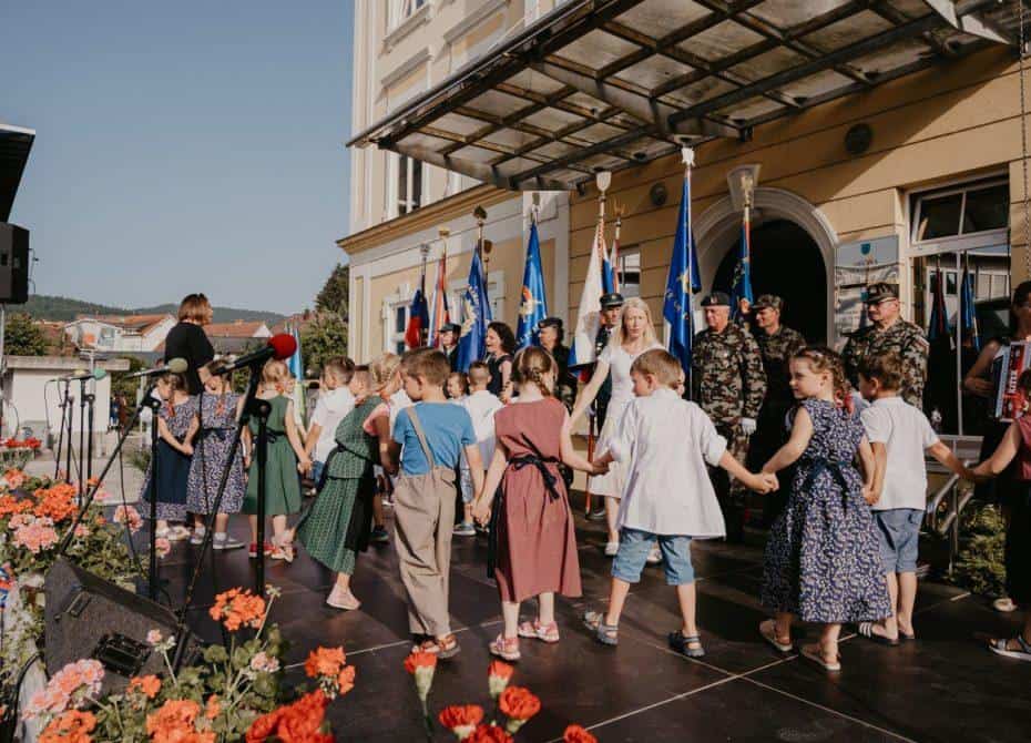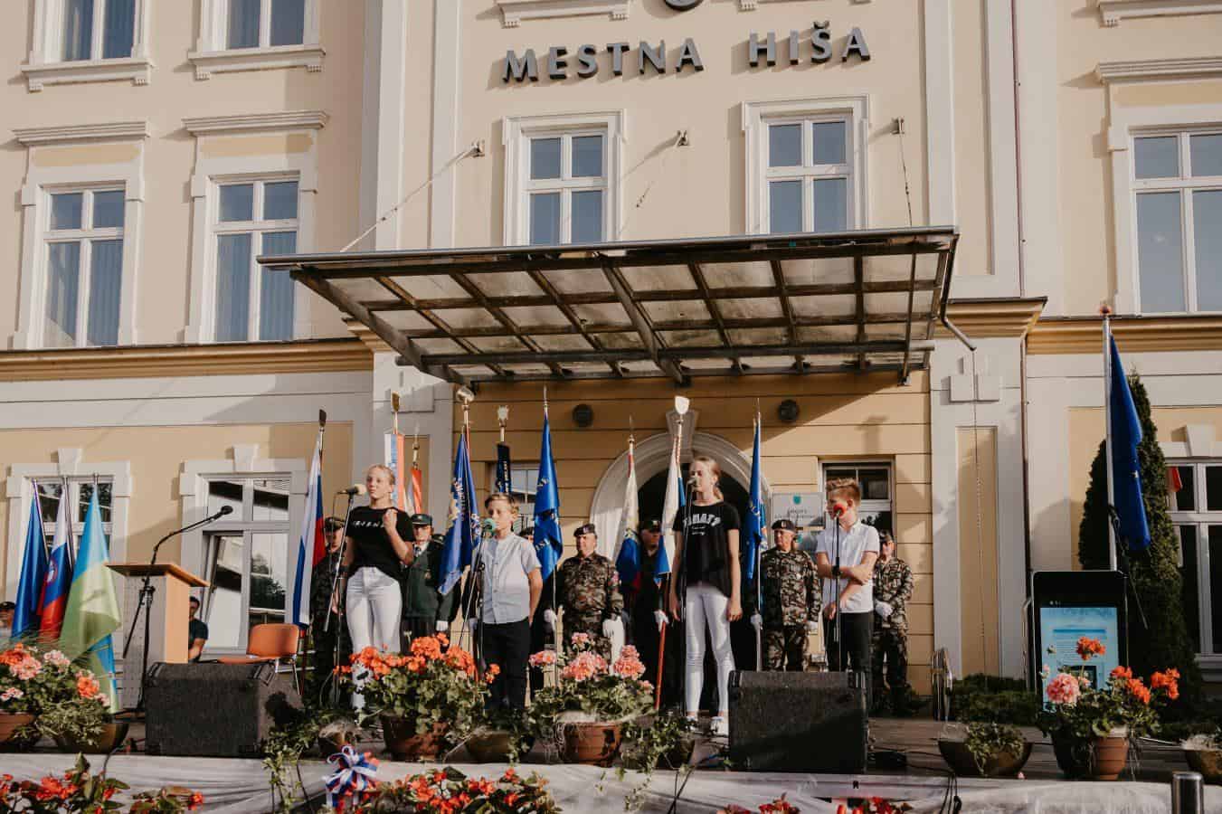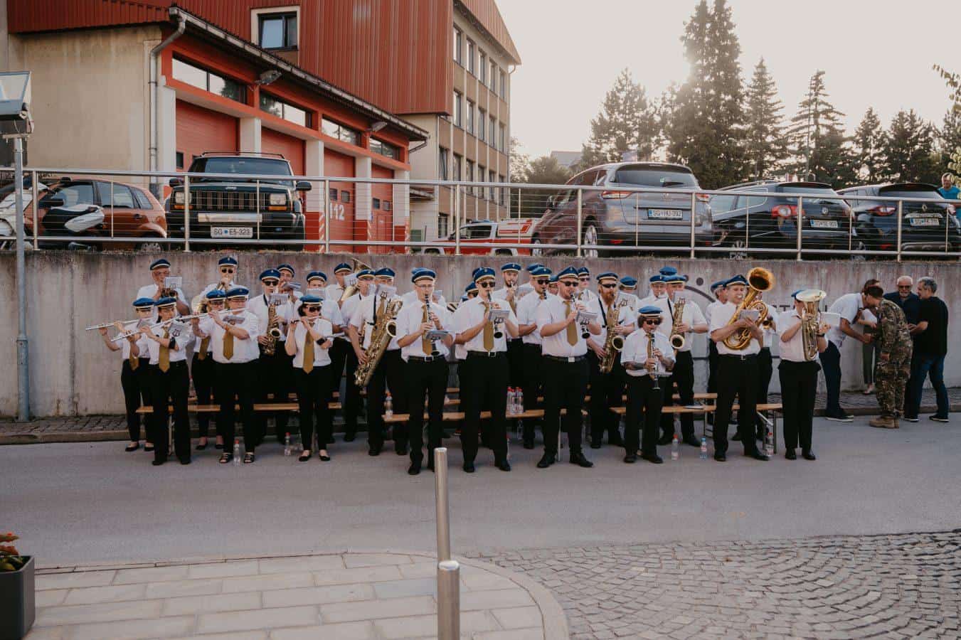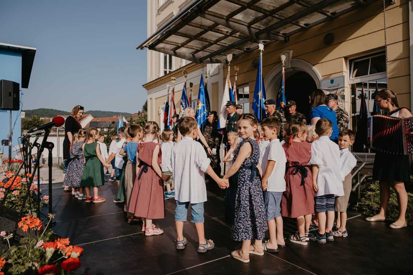 V plesnih korakih pa sta zbrane navdušila Jon Mori in Ina Belaj. Na harmoniki je učenec Glasbene šole Ravne Andraž Gangl izvedel narodni napev in zimzeleno Avsenikovo Slovenija, od kod lepote tvoje. Za posebej slavnostno vzdušje so poskrbele članice in člani našega Pihalnega orkestra Železarjev Ravne ter mnogi praporščaki pod vodstvom Jožeta Temnikarja.