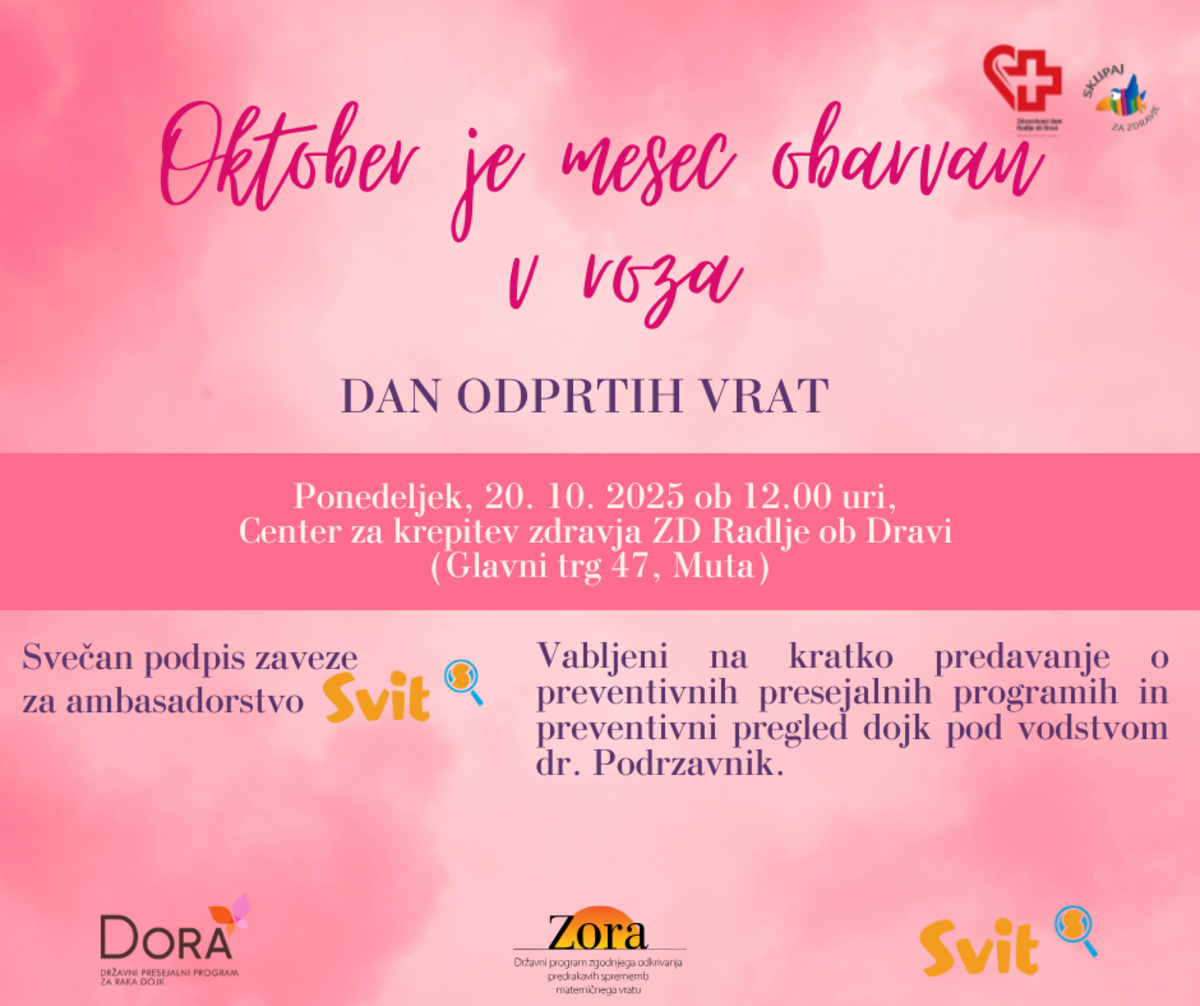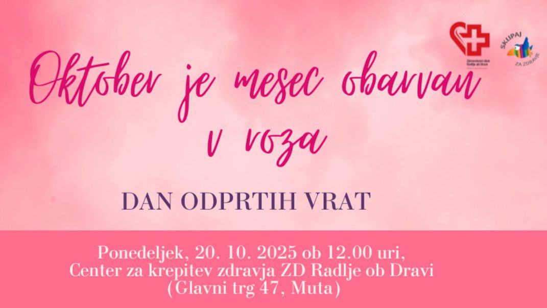 Oktober je že tradicionalno mesec, posvečen ozaveščanju o pomenu preventive pri odkrivanju raka dojk. V ta namen bo Center za krepitev zdravja ZD Radlje ob Dravi organiziral Dan odprtih vrat, ki bo potekal jutri , 20. oktobra 2025, ob 12. uri v prostorih centra (Glavni trg 47, Muta).