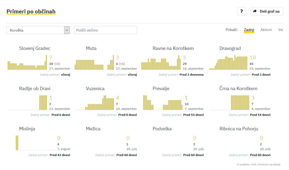 Okužbo so v četrtek potrdili v več kot 60 občinah, največ, 37, so jih zabeležili v Ljubljani, kjer je trenutno 232 aktivnih okužb. Po pet so jih v četrtek potrdili v Kranju in Kamniku, v Mariboru in Šmarju pri Jelšah po štiri, po tri primere okužb so potrdili v občinah Rogaška Slatina, Pivka, Domžale, Ilirska Bistrica, Trbovlje in Slovenj Gradec. V ostalih občinah so potrdili po dve ali eno okužbo.