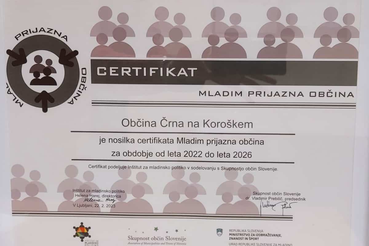 Občina Črna na Koroškem je imetnica certifikata od leta 2013, s ponovno obnovitvijo pa je tako že drugič obnovila in prejela nov certifikat Mladim prijazna občina za obdobje 2022-2026. Certifikat je na prireditvi prevzel občinski svetnik dr.Tomaž Simetinger.
