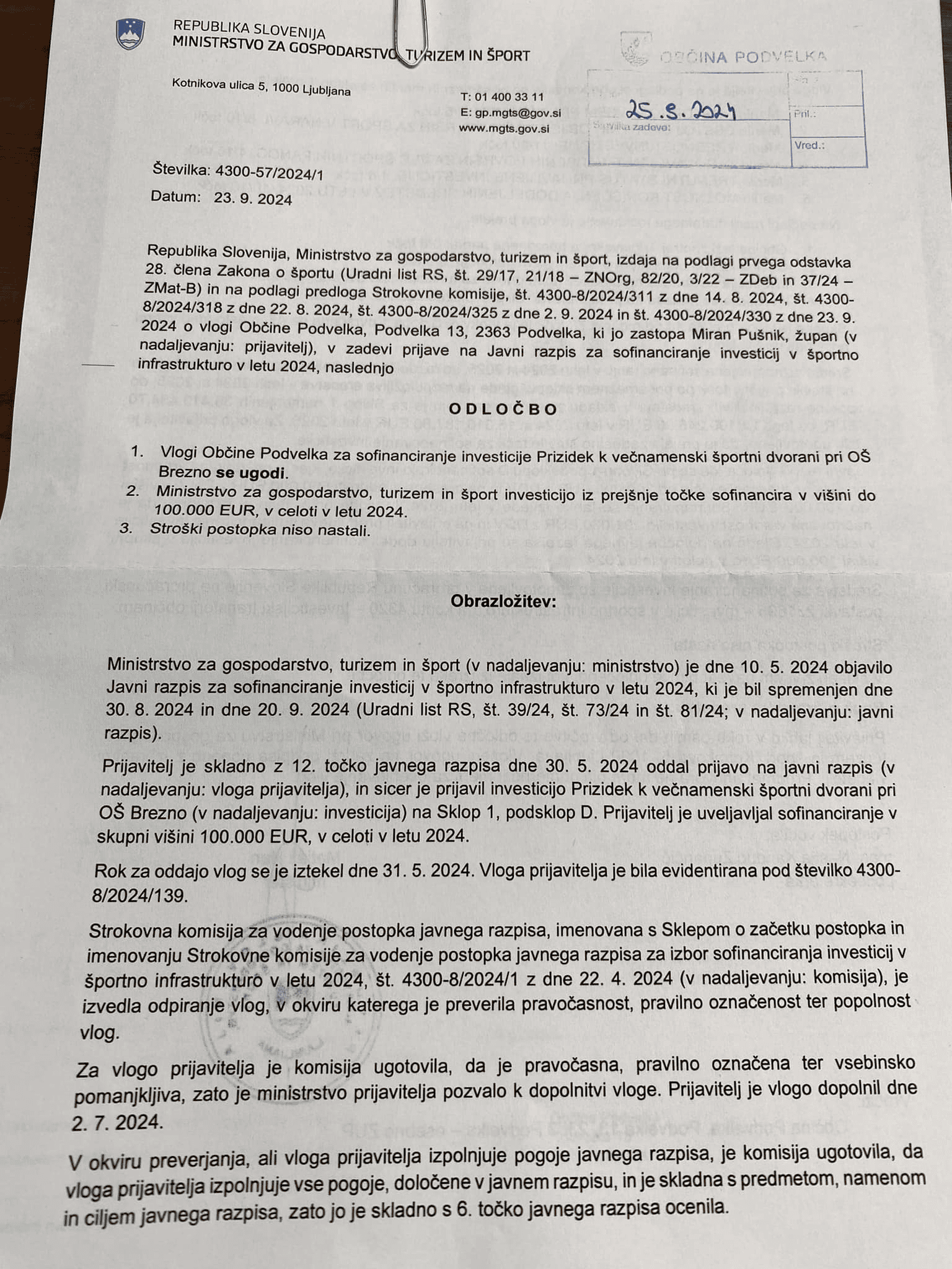 Tako so se tudi v Občini Podvelka razveselili pozitivne odločbe odločbe iz Ministrstva za gospodarstvo, turizem in šport s katero bodo prejeli 100.000,00€ sredstev za prizidek k športni dvorani.