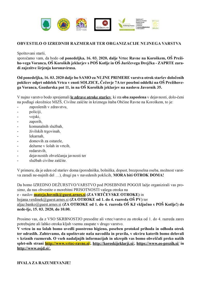 Iz Občine Mislinja so sporočili: "Spoštovani starši,obveščamo vas, da se bo uredba o zaprtju šole spremenila na ta način, da prepoved zbiranja v šolah ne bo veljala v primerih potrebe po nujnem varstvu otrok. Nujno varstvo otrok bo organizirano le za učence od 1. do vključno 5. razreda. Nujno varstvo učencev se izkazuje s pisno izjavo delodajalca, pri katerem so starši zaposleni (pridobi starš), da opravljajo delo, ki je pomembno za delovanje družbe in države v izrednih razmerah (zdravstveni delavci, zaposleni v civilni zaščiti, vojski in policiji ter v drugih službah, ki so pomembne za oskrbo prebivalstva)."