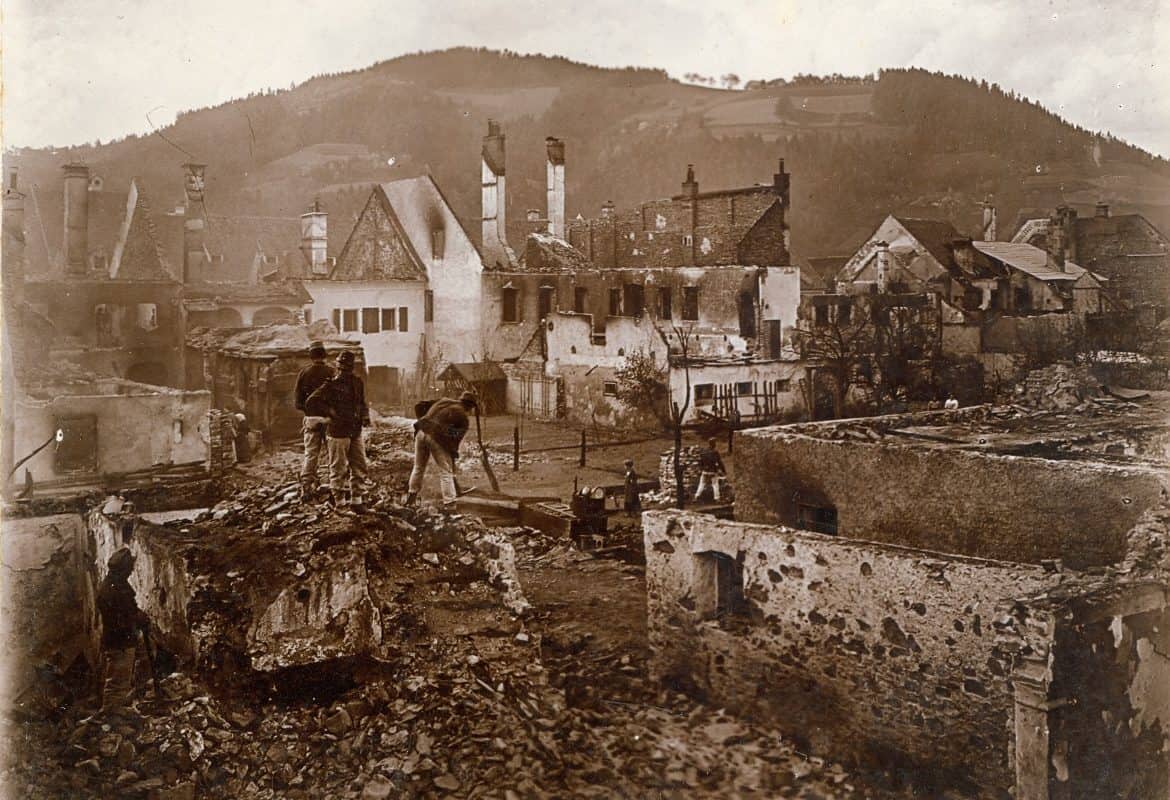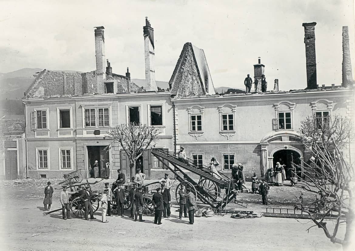 »Bilo je v nedeljo popoldne ob tretji uri, 10. maja leta 1903. V cerkvi je bilo precej ljudi pri popoldanskem bogoslužju. Tedaj je nenadoma zadonel klic: 'Gori, gori!' Ljudje so se pognali na cesto. Ena izmed hiš v Cerkveni, današnji Meškovi ulici je bila že vsa v ognjenih zubljih. Tu je prebivala neka vdova, Marija Požgan po imenu, kot navajajo vsa tedanja poročila. Čudno ime za ženo, ki je nehote povzročila požar. Nekateri časopisi so pozneje poročali, da je ta Požganova zanetila ogenj na odprtem ognjišču in da je veter odnesel iskre na podstrešje, ki se je vnelo. Drugi so poročali, da je žena stresla še tleči pepel na dvorišče in da se je najprej vnel hlev. Drži pa, da je tisto popoldne zavijal po Slovenj Gradcu hud veter, ki je menjaval svojo smer in potegnil s sunki zdaj s severa, zdaj z juga.