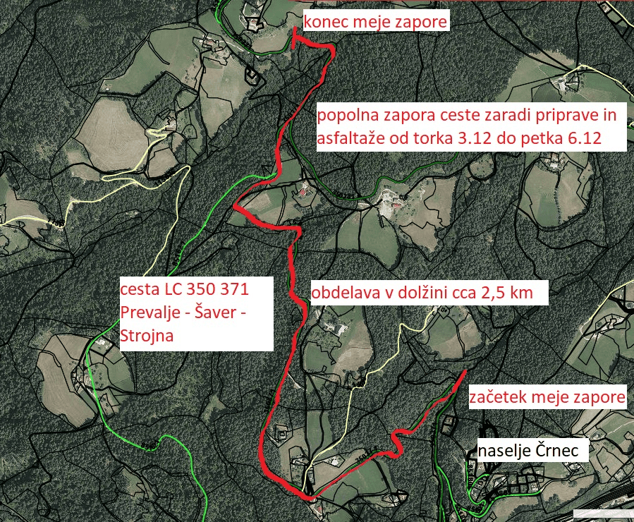 Izvajalec del, gradbeno podjetje TOP - KOP d.o.o. iz Slovenj Gradca sporoča, da bo zaradi priprave cestišča na asfaltažo ter asfaltaže ceste, popolnoma zaprta lokalna cesta LC 350 371 – Prevalje – Šaver -Strojna.