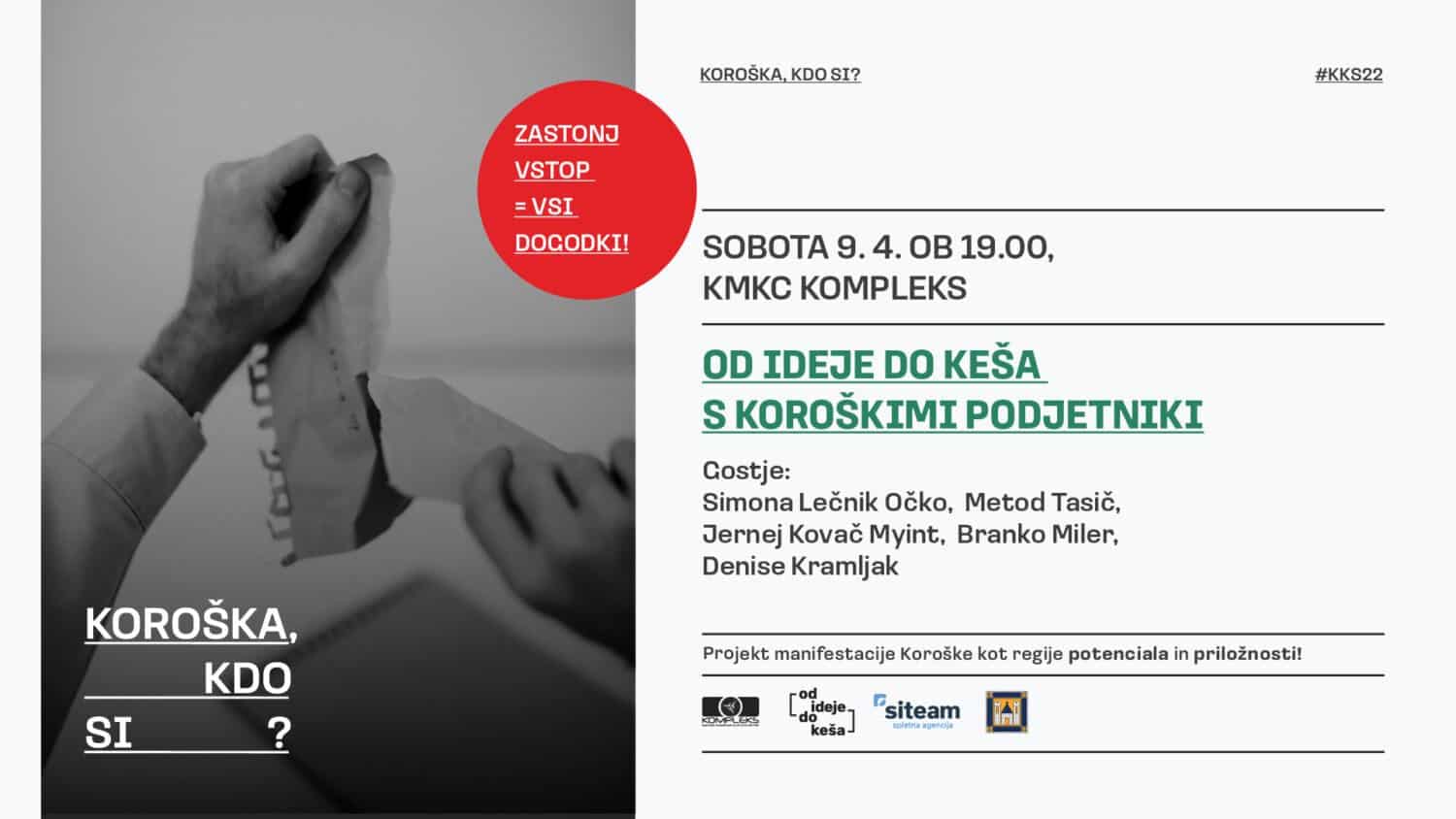 Namenjen je vsem, ki imajo podjetniško željo in željo svojo idejo udejanjit ter z njo ustvariti boljši svet, ob tem pa še zaslužiti. Na srečanjih Od ideje do keša, ki potekajo v Kompleksu na Ravnah, se obiskovalcem s podjetniško idejo predstavijo podjetniki, ki so lastne podjetniške ideje že preizkusili na trgu in z njimi uspeli.