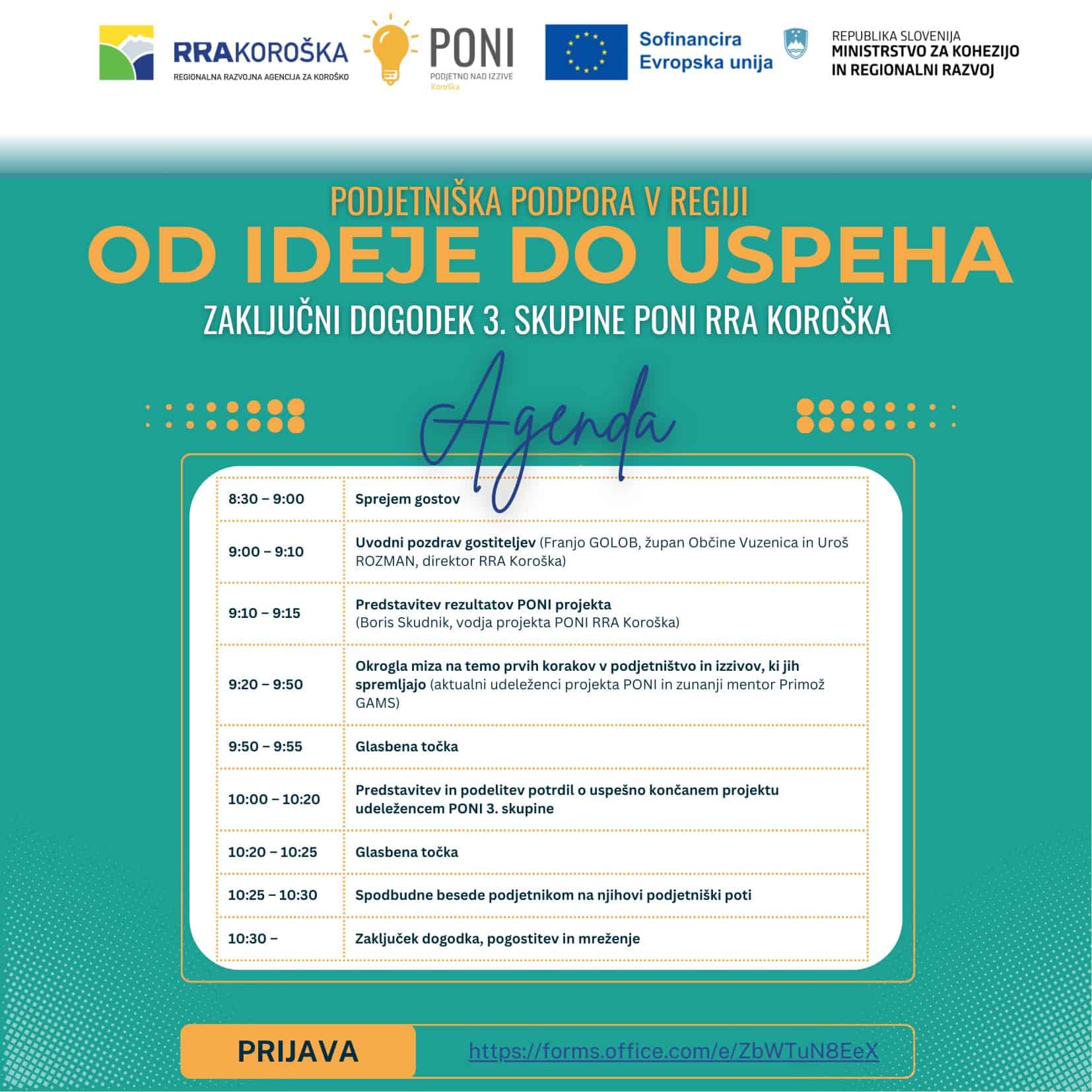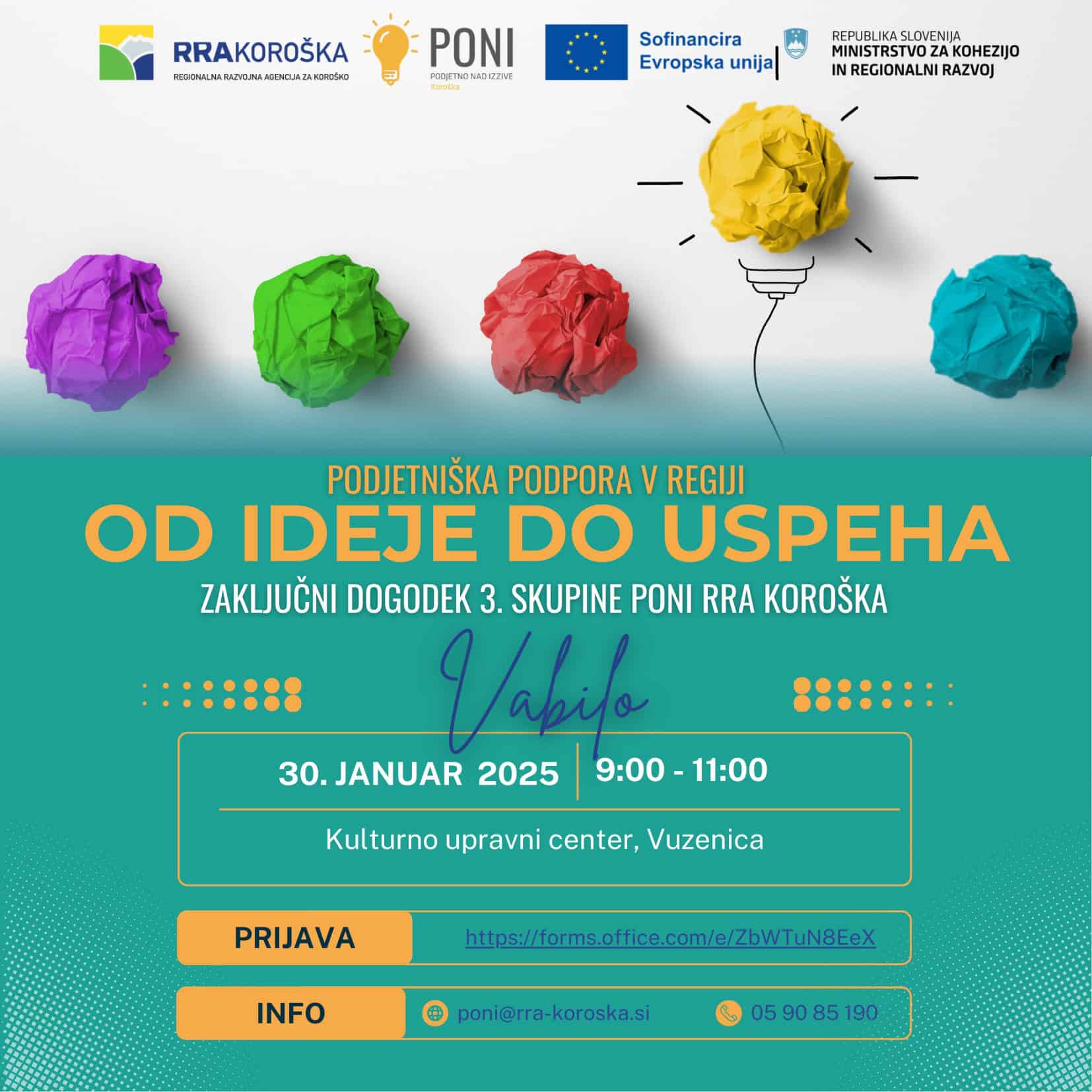 Regionalna razvojna agencija za Koroško (RRA Koroška) vljudno vabi na zaključni dogodek 3. skupine podjetniškega programa PONI, ki bo potekal v četrtek, 30. januarja 2025, od 9.00 do 11.00 v Kulturno upravnem centru Vuzenica.