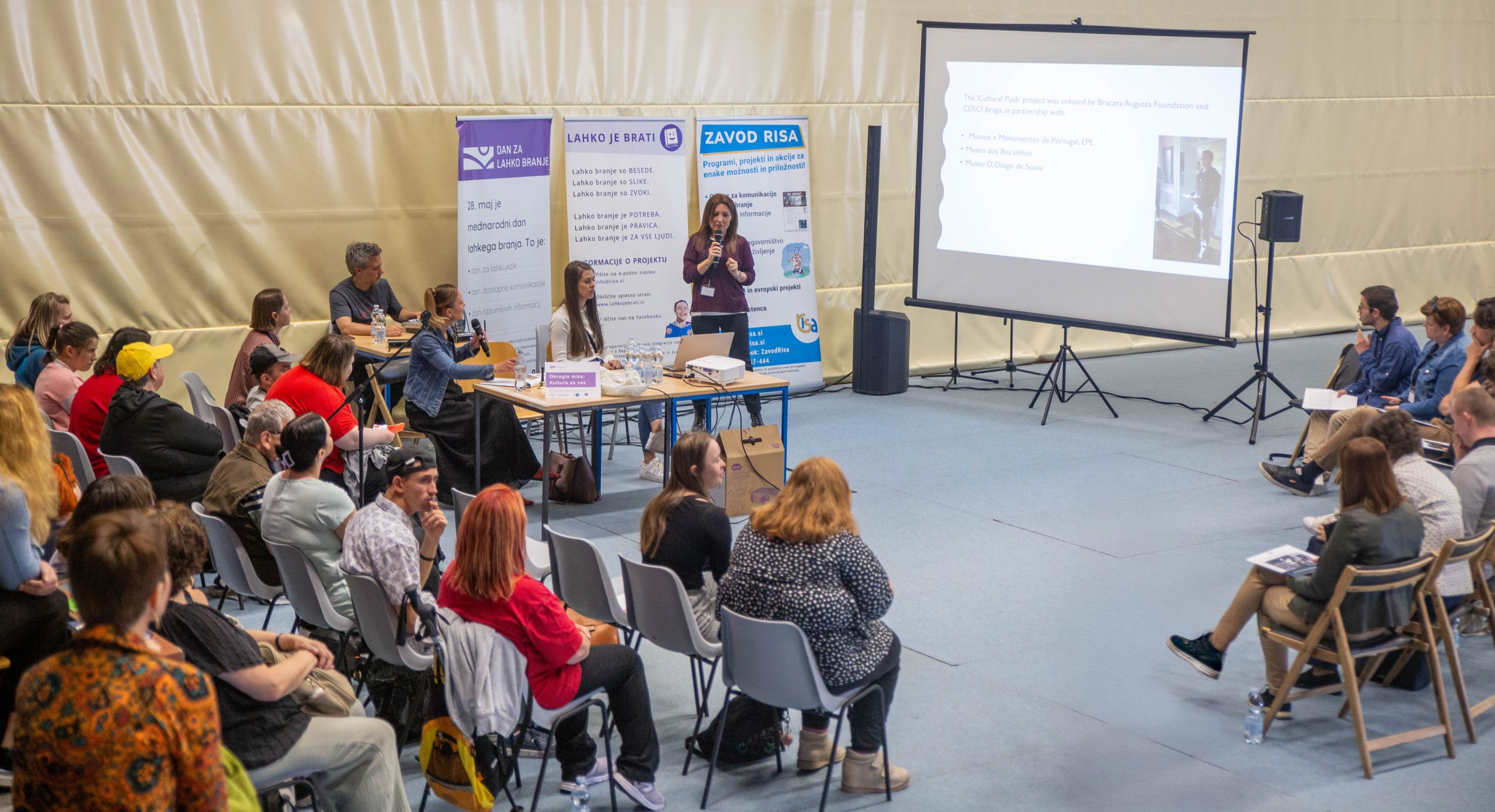 Na okrogli mizi »Kultura za vse« so sodelovali predstavniki Muzeja novejše in sodobne zgodovine Slovenije, Narodne galerije, Koroškega pokrajinskega muzeja, Koroške galerije likovnih umetnosti ter portugalske organizacije CERCI Braga. Pogovor je osvetlil, kako kulturne ustanove vključujejo osebe z oviranostmi ter ustvarjajo razstave in gradiva v lahkem jeziku. Poleg okrogle mize so se udeleženci udeležili tudi treh delavnic: Kako rišem lahko branje, Senzorno branje in Novice s tretje police. Delavnice so omogočile praktičen vpogled v ustvarjanje dostopnih vsebin v lahkem branju.