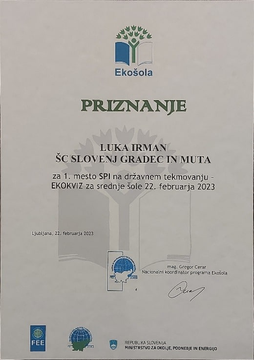 Med njimi je bil tudi Luka Irman, dijak 2.letnika programa mizar SPI, Srednje šole Slovenj Gradec in Muta, ki je bil v kvizu najboljši in tako osvojil prvo mesto.