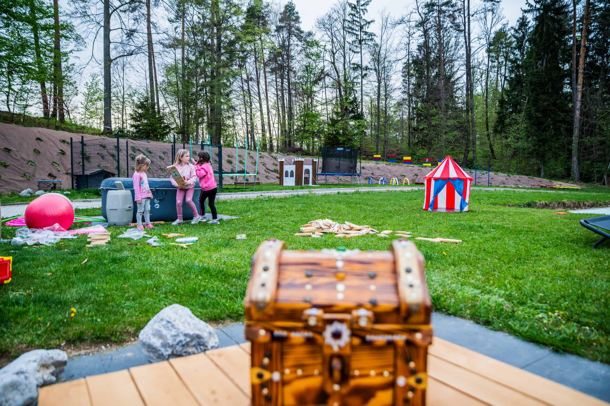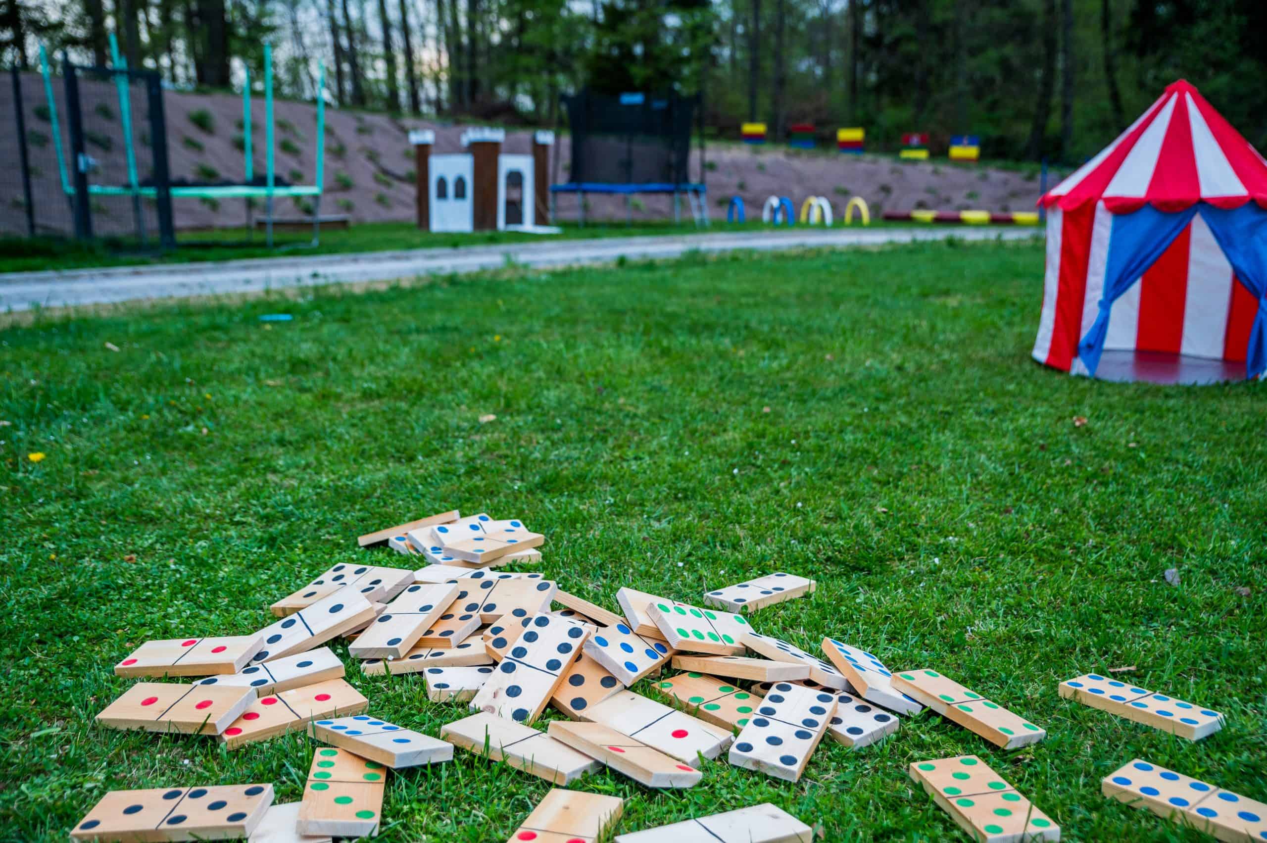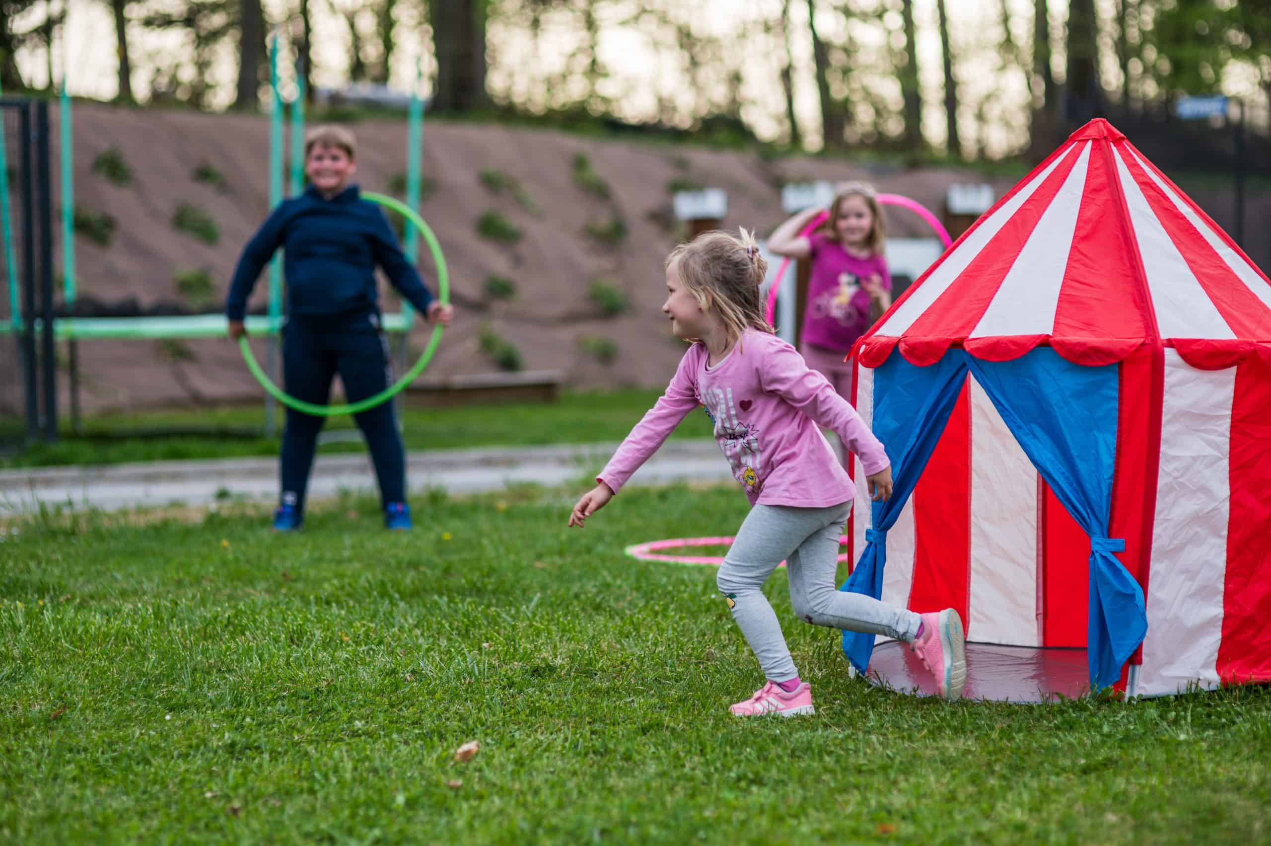 Na voljo bodo imeli poligon, kjer bodo lahko preizkusili svoje spretnosti. Podali se bodo na lov za skritim zakladom in se preizkusili v streljanju na tarče. V vročih dnevih pa se bodo lahko ohladili z vodnimi pištolami. V Deželi zabave jih čaka tudi igrišče za nogomet, odbojko, kroket, badminton in trampolini. Lahko se bodo igrali z velikimi dominami, risali, slikali, vrteli hulahop obroče, podirali keglje in počeli še veliko zabavnih reči.