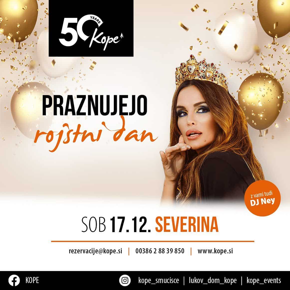 V soboto, 17. decembra, od 20. ure dalje pa bodo svoj jubilej proslavili v družbi največje pop ikone na ozemlju jugoslovanskih republik, ki tokrat premierno prihaja na Kope in to je Severina. Njeni koncerti so pravi spektakli in nič drugače ne bo na Kopah. Ne zamudite največje in najbolj nore rojstnodnevne zabave.