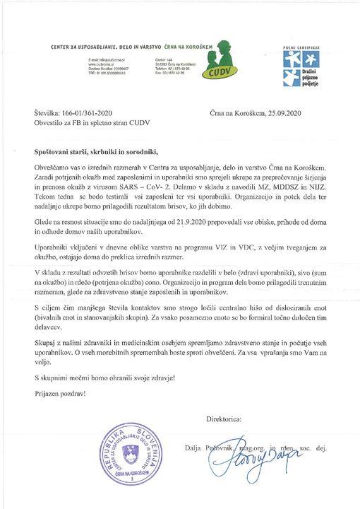 Kot je direktorica CUDV Črna mag. Dalja Pečovnik danes sporočila prek spletne strani zavoda, v skladu z rezultati brisov uporabnike razvrščajo v belo, sivo in rdečo cono in skladno s tem organizirajo delo. S ciljem, da pride do čim manj kontaktov, so tudi strogo ločili centralno stavbo od dislociranih enot.