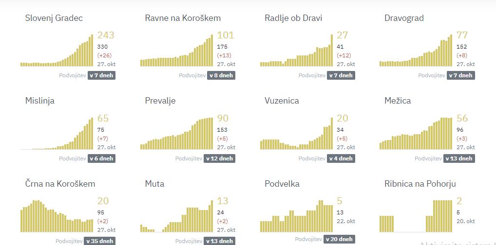 Po podatkih Covid-19 sledilnika so v Sloveniji v torek ob 7471 opravljenih testih potrdili 2605 novih okužb s koronavirusom, kar je daleč najvišji dnevni prirast novopotrjenih okužb doslej. Prvič je število okužb v enem dnevu preseglo 2000. V bolnišnicah se zdravi 612 bolnikov s covidom-19, na intenzivnih enotah 99, 14 ljudi s potrjeno okužbo je umrlo. Iz bolnišnice so odpustili 54 oseb.