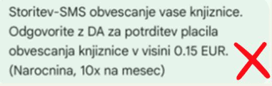 Bodite pozorni na morebitne zlorabe, kajti, če prejmete SMS-sporočila, ko je prikazano na sliki, in od vas zahteva dodatna plačila, jih nikar ne potrjujte.