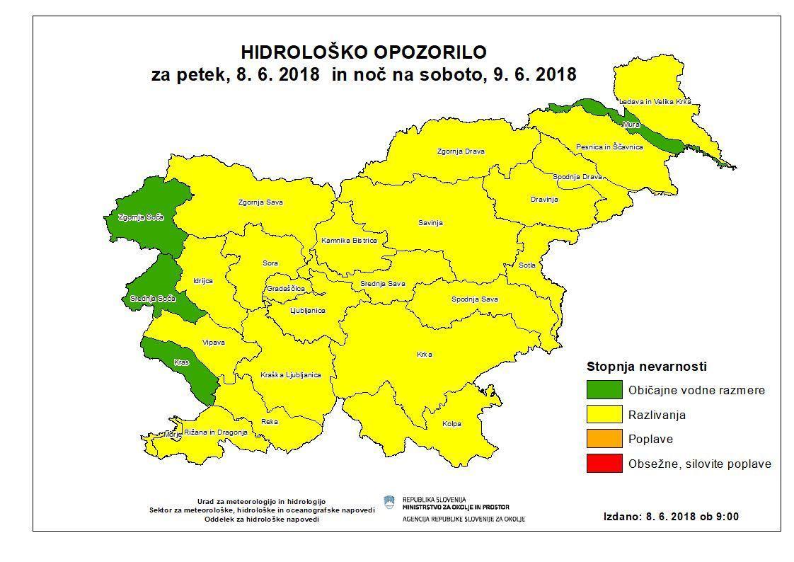 Danes popoldan, zvečer in v noči na soboto bodo ob močnejših nevihtah hitro narasli manjši vodotoki in hudourniki. Ponekod lahko pride do razlivanj. Pojav je možen v večjem delu države, zlasti pa v vzhodni in severovzhodni Sloveniji.