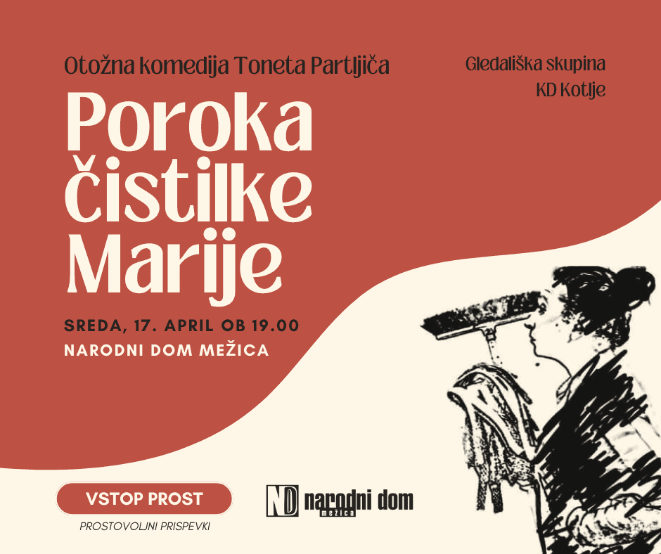 Člani gledališke skupine KD Kotlje bodo s komedijo Poroka čistilke Marije v Narodnem domu Mežica nastopili jutri, v sredo, 17. aprila 2024, ob 19. uri.
