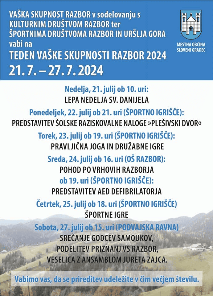 Vaška skupnost Razbor v sodelovanju s Kulturnim društvom Razbor ter Športno društvo Razbor in Uršlja Gora vabi vse na Teden vaške skupnosti Razbor 2024, ki bo potekal od nedelje, 21. julija do sobote 27. julija 2024.