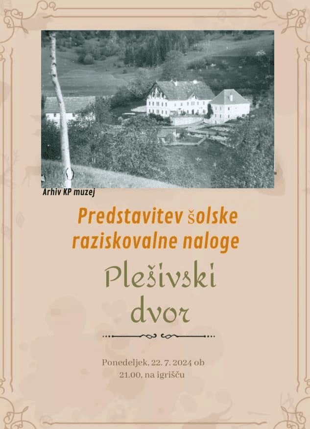 Ob 21. uri bo na športnem igrišču potekala predstavitev šolske raziskovalne naloge z naslovom "Plešivški dvor". Raziskovalna naloga je bila pred tem predstavljena tudi na 58. Srečanju mladih raziskovalcev v Murski Soboti in prejela srebrno priznanje.