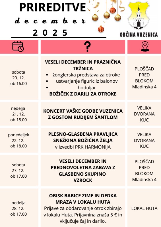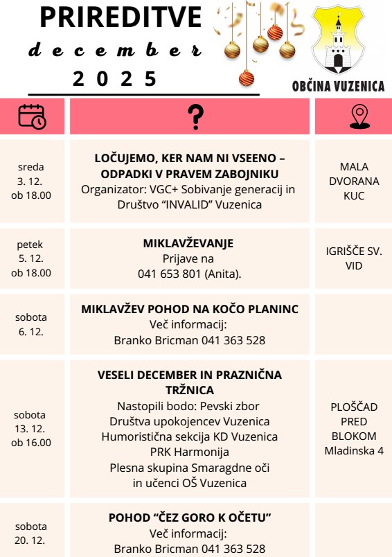 S pestrimi dogodki bodo pričeli že v sredo, 3. decembra 2025, ko bodo pripravili delavnico ''Ločujemo, ker nam ni vseeno - odpadki v pravem zabojniku''. Že dva dni kasneje, v petek, 5. decembra, bo Vuzenico obiskal prvi od dobrih mož in otroke razveselil na Miklavževanju.