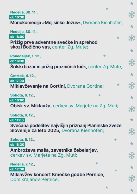 S prazničnim dogajanjem so pričeli že v nedeljo, 30. novembra 2025, koje občinstvo nasmejala monokomedija ''Moj sinko Jezus'', zvečer, ob 18. uri, pa je sledil prižig prve adventne svečke in sprehod skozi Božično vas. Stojnice šolskega barazrja so navdušile ob prižigu prazničnih lučk, Miklavž pa je že tudi obiskal vse dele občine Muta. Prav tako so podelili Najvišja priznanja Planinske zveze Slovenije za leto 2025, potekala je Ambroževa maša, zavetnika čebelarjev, z Miklavževim koncertom je očarala Kmečka godba Pernice, pretekli nedelski večer pa je s kulturo popestril Matjaž Pikalo.
