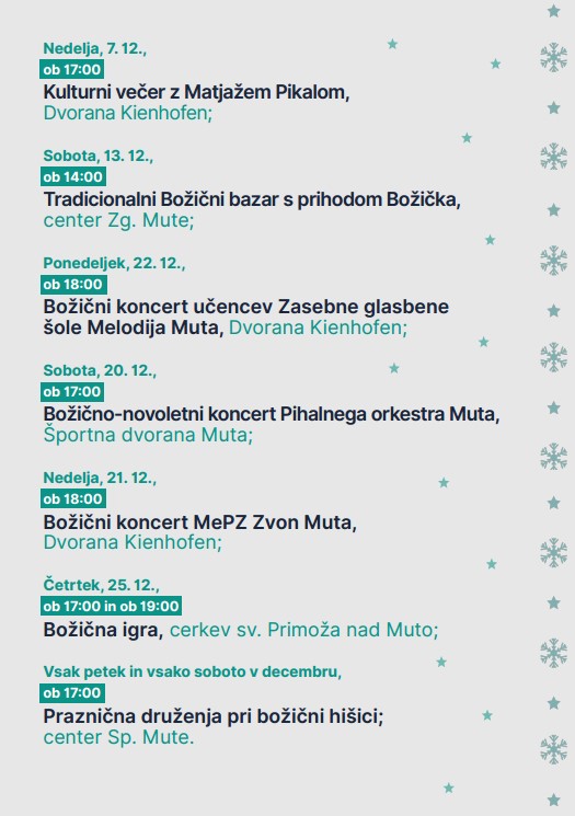 Vabljeni, da čudovite, praznične decembrske dni preživite v družbi svojih najdražjih, družine in prijateljev, ter se skupaj poveselite na dogodkih, ki bodo na Muti pričarali še lepši praznični mesec.